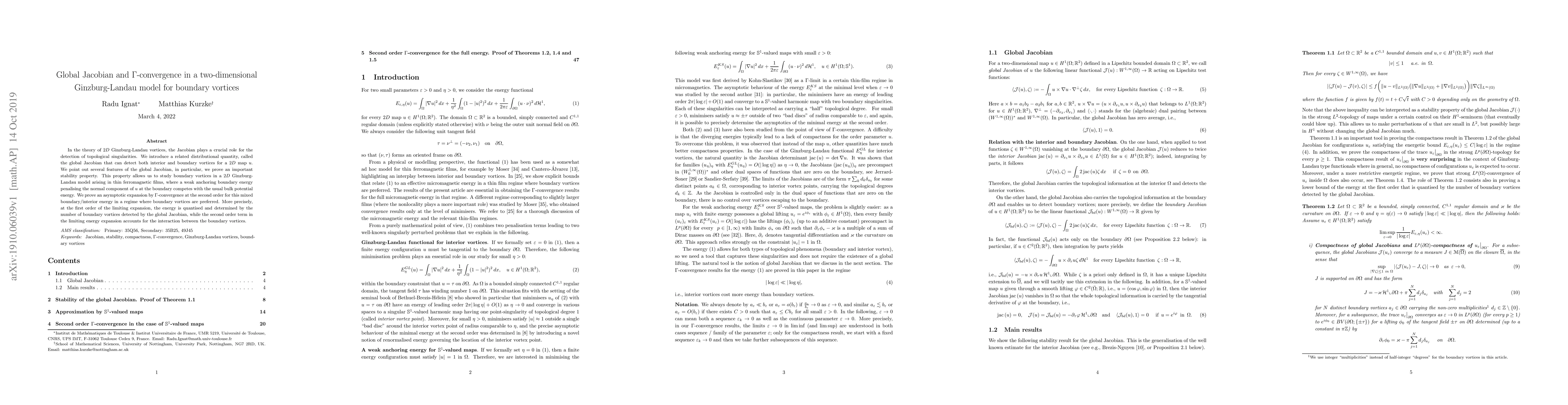 In the theory of $2D$ Ginzburg-Landau vortices, the Jacobian plays a crucial role for the detection of topological singularities. We introduce a related distributional quantity, called the global Jacobian that can detect both interior and boundary vortices for a $2D$ map $u$. We point out several features of the global Jacobian, in particular, we prove an important stability property. This property allows us to study boundary vortices in a $2D$ Ginzburg-Landau model arising in thin ferromagnetic films, where a weak anchoring boundary energy penalising the normal component of $u$ at the boundary competes with the usual bulk potential energy. We prove an asymptotic expansion by $\Gamma$-convergence at the second order for this mixed boundary/interior energy in a regime where boundary vortices are preferred. More precisely, at the first order of the limiting expansion, the energy is quantised and determined by the number of boundary vortices detected by the global Jacobian, while the second order term in the limiting energy expansion accounts for the interaction between the boundary vortices.
