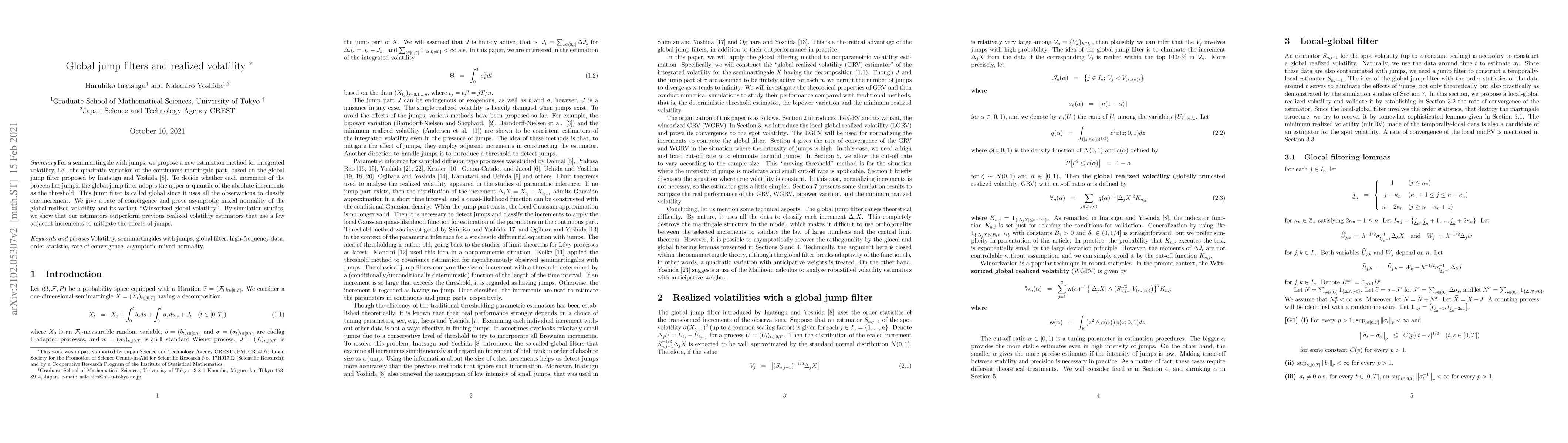 A new method for estimating integrated volatility in semimartingales with jumps uses a global jump filter that classifies increments based on the upper ε-quantile of absolute increments. The estimator outperforms previous methods by using all observations to mitigate the effects of jumps.