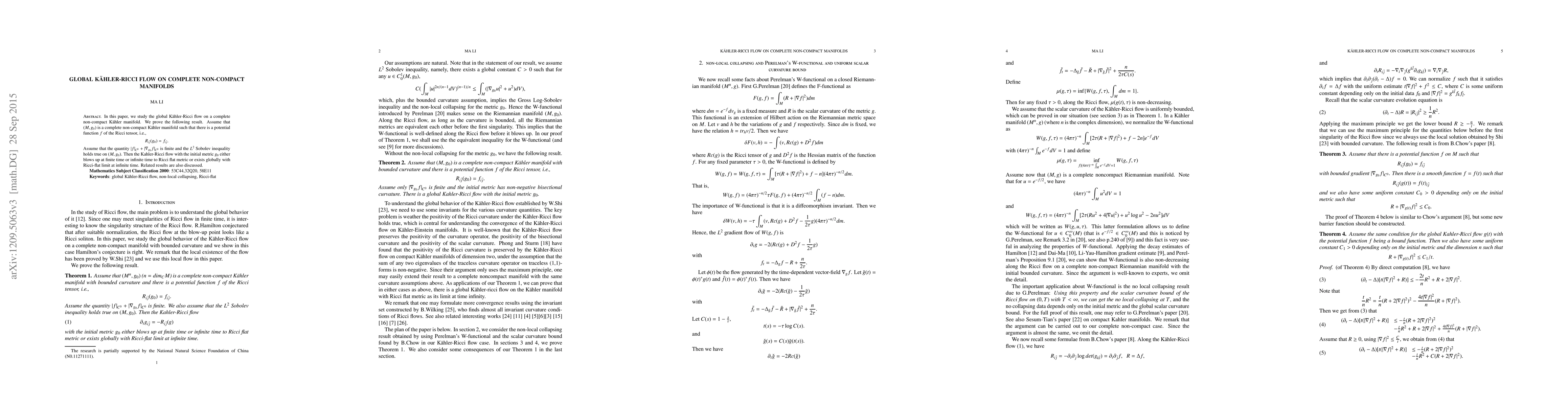 In this paper, we study the global K\"ahler-Ricci flow on a complete non-compact K\"ahler manifold. We prove the following result. Assume that $(M,g_0)$ is a complete non-compact K\"ahler manifold such that there is a potential function $f$ of the Ricci tensor, i.e., $$ R_{i\bar{j}}(g_0)=f_{i\bar{j}}. $$ Assume that the quantity $|f|_{C^0}+|\nabla_{g_0}f|_{C^0}$ is finite and the L2 Sobolev inequality holds true on $(M,g_0)$. Then the Kahler-Ricci flow with the initial metric $g_0$ either blows up at finite time or infinite time to Ricci flat metric or exists globally with Ricci-flat limit at infinite time. A related is also discussed.