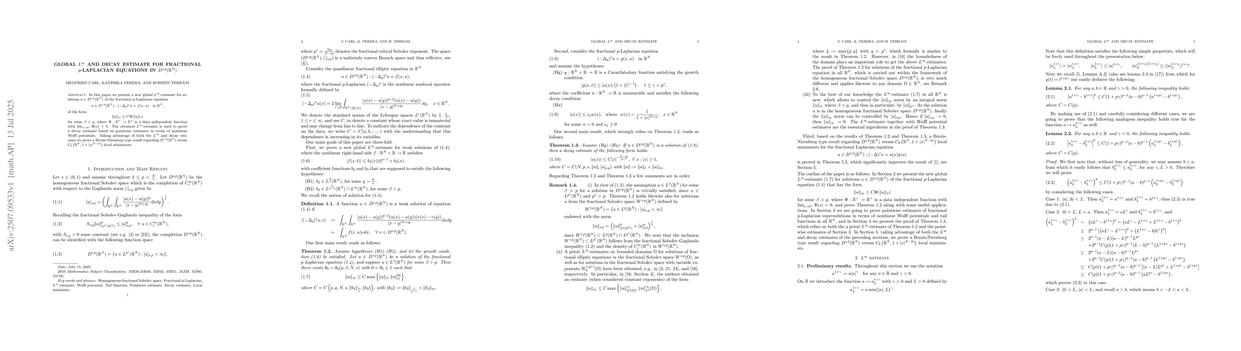 In this paper we present a new global $L^\infty$-estimate for solutions $u\in D^{s,p}(\R^N)$ of the fractional $p$-Laplacian equation % $$ u\in D^{s,p}(\R^N): (-\Delta_p)^s u=f(x,u) \quad\mbox{in }\R^N, $$ % of the form % $$ \|u\|_{\infty}\le C \Phi(\|u\|_{\beta}) $$ % for some $\beta> p$, where $\Phi: \R^+\to \R^+$ is a data independent function with $\lim_{s\to 0^+}\Phi(s)=0$. The obtained $L^\infty$-estimate is used to prove a decay estimate based on pointwise estimates in terms of nonlinear Wolff potentials. Taking advantage of both the $L^\infty$ and decay estimate we prove a Brezis-Nirenberg type result regarding $D^{s,2}(\R^N)$ versus $C_b\left(\R^N, 1+|x|^{N-2s}\right)$ local minimizers.