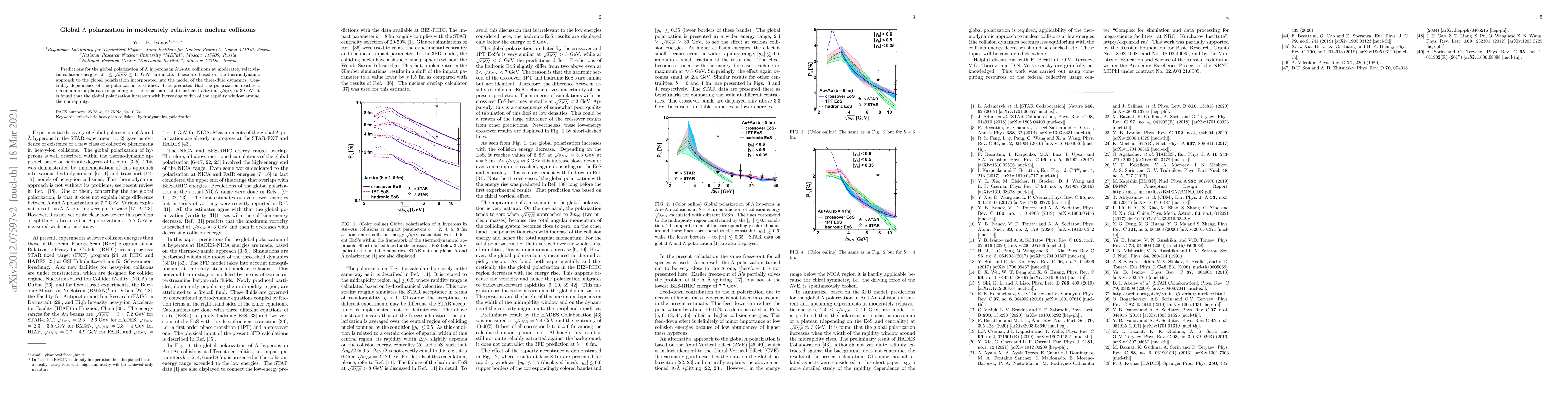 Predictions for the global polarization of $\Lambda$ hyperons in Au+Au collisions at moderately relativistic collision energies, 2.4 $\leq\sqrt{s_{NN}}\leq$ 11 GeV, are made. These are based on the thermodynamic approach to the global polarization incorporated into the model of the three-fluid dynamics. Centrality dependence of the polarization is studied. It is predicted that the polarization reaches a maximum or a plateau (depending on the equation of state and centrality) at $\sqrt{s_{NN}}\approx$ 3 GeV. It is found that the global polarization increases with increasing width of the rapidity window around the midrapidity.