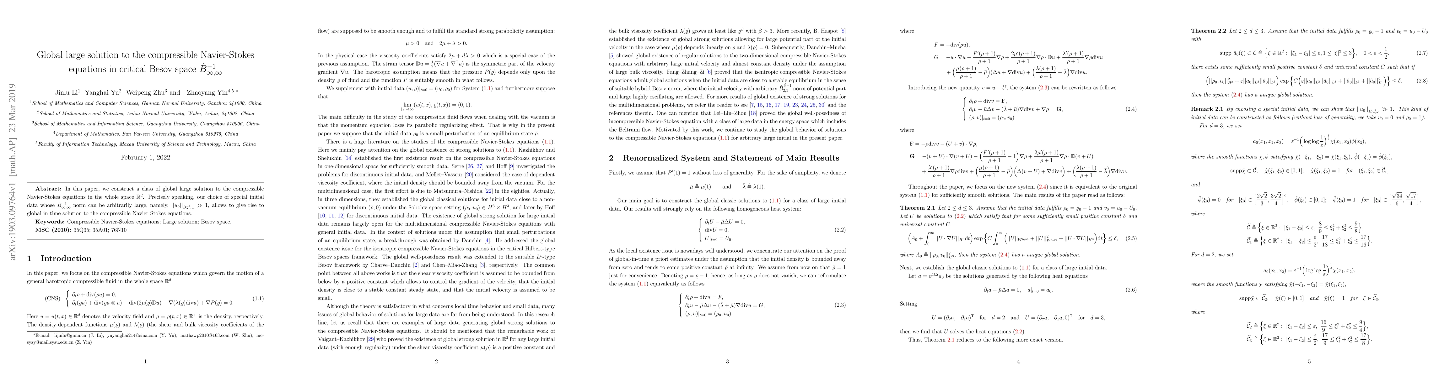 This paper constructs global large solutions to the compressible Navier-Stokes equations in the whole space using initial data with large $\dot{B}^{-1}_{\infty,\infty}$ norm, demonstrating the existence of global-in-time solutions under these conditions.