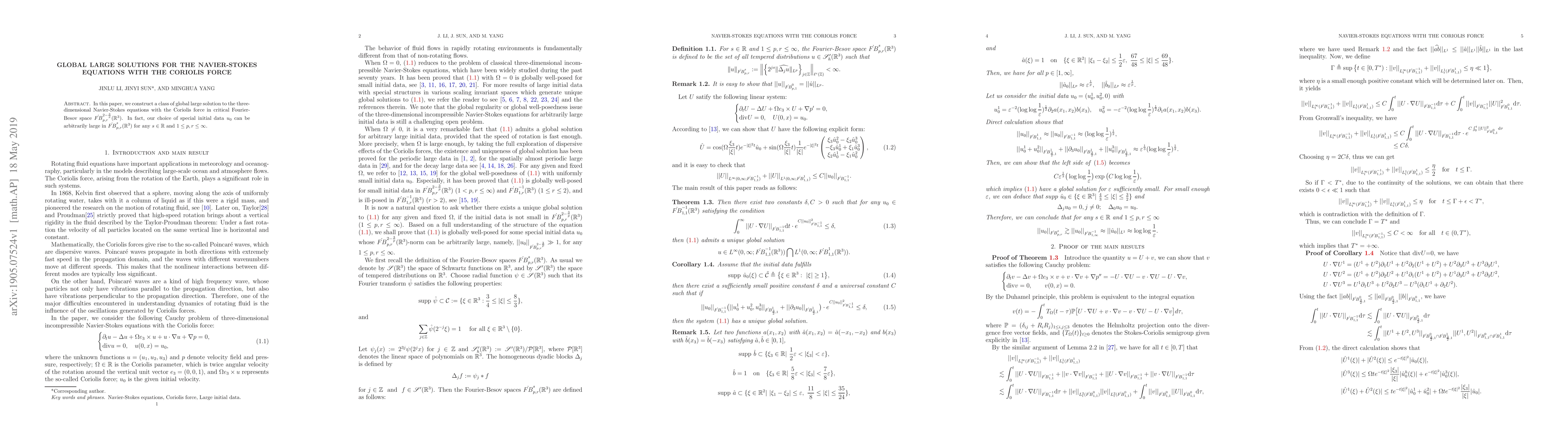 This paper constructs a class of global large solutions to the three-dimensional Navier-Stokes equations incorporating the Coriolis force, demonstrating that specific initial data can be arbitrarily large in critical Fourier-Besov space. The solutions are derived in the space $\dot{FB}^{2-\frac{3}{p}}_{p,r}(\mathbb{R}^3)$.