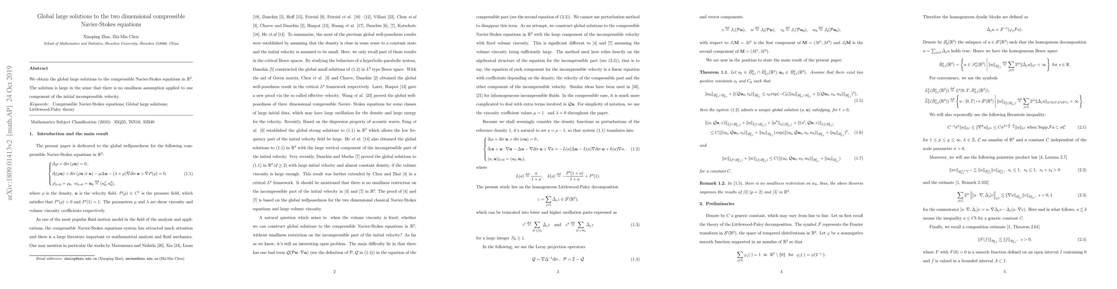 Summary: This paper presents global large solutions to the two-dimensional compressible Navier-Stokes equations in $\mathbb{R}^2$ without requiring smallness assumptions on the initial velocity. The findings extend the applicability of the solutions to scenarios where the initial conditions are substantial.