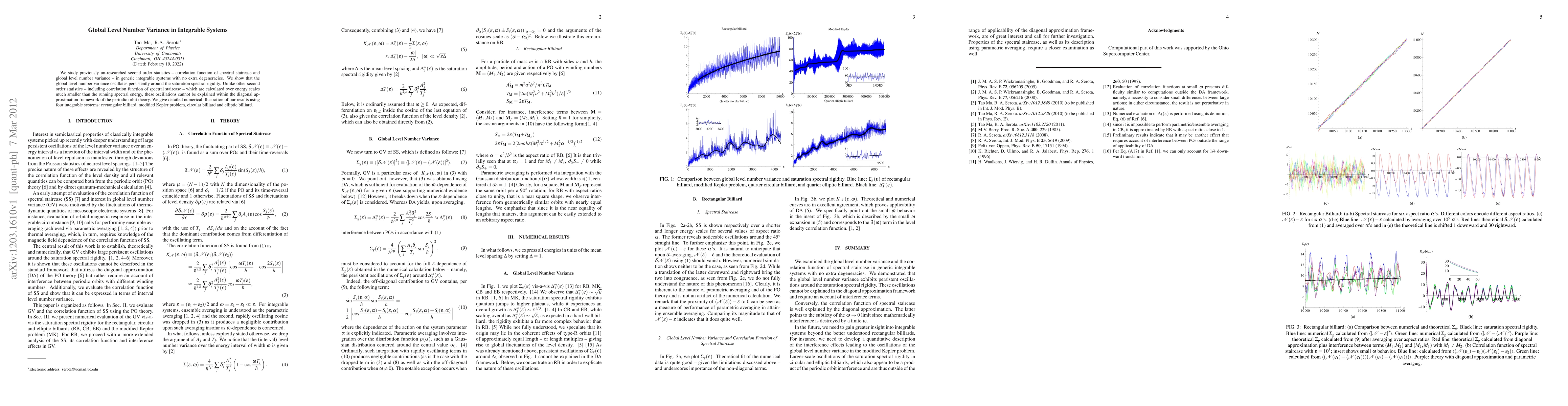 This paper explores second-order statistics in integrable systems, specifically the global level number variance, which persistently oscillates around saturation spectral rigidity. Unlike other statistics, these oscillations cannot be explained by the diagonal approximation framework of periodic orbit theory, as demonstrated through numerical examples in four different integrable systems.
