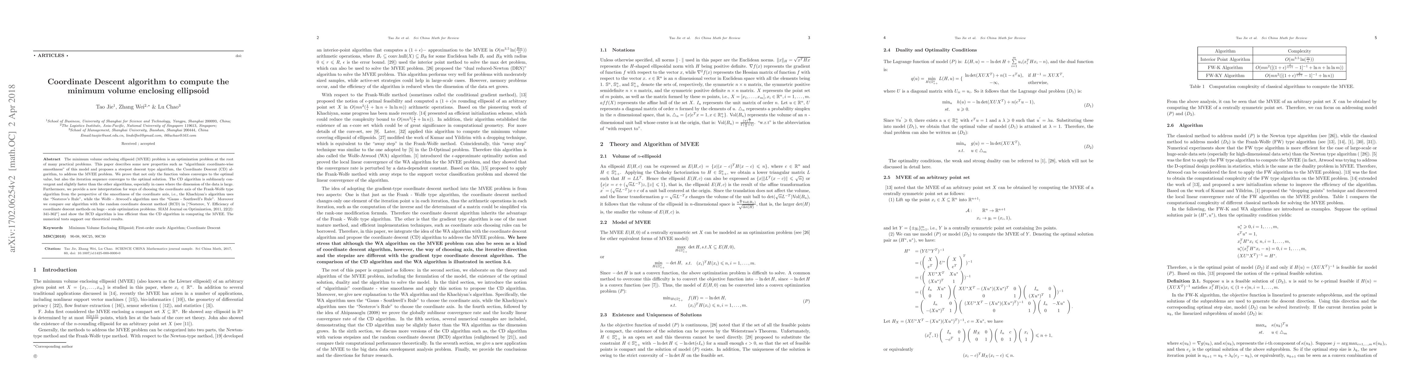 A new algorithm, Adjusted Coordinate Descent (ACD), is proposed to solve the minimum volume enclosing ellipsoid problem, which is shown to be globally linearly convergent and outperforms existing algorithms for large-dimensional data.