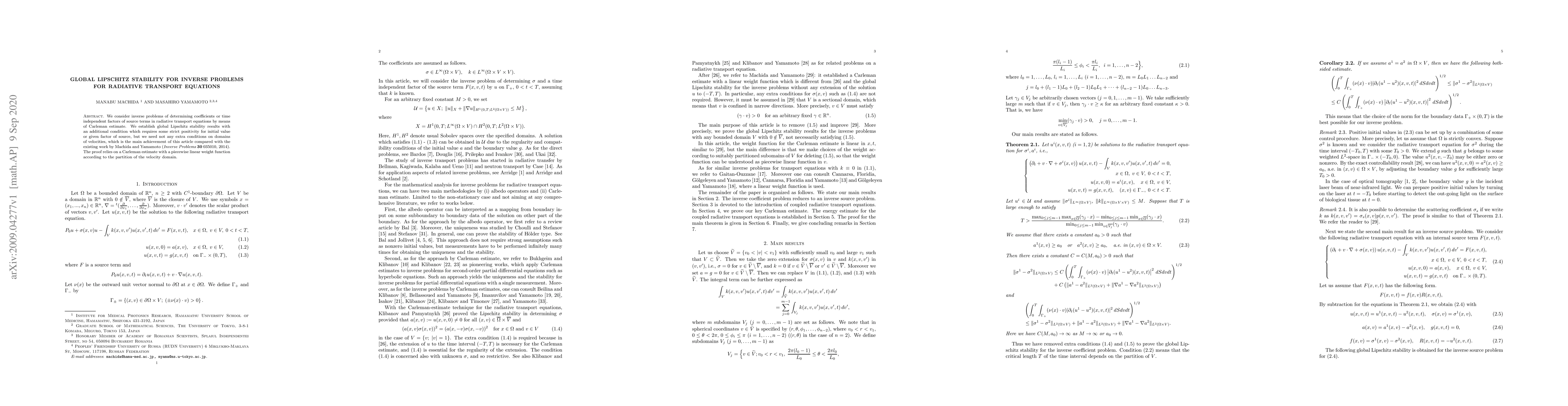 This paper establishes global Lipschitz stability for inverse problems in radiative transport equations using Carleman estimates. It achieves this without requiring additional conditions on velocity domains, unlike previous work, by imposing strict positivity on initial values or source factors.