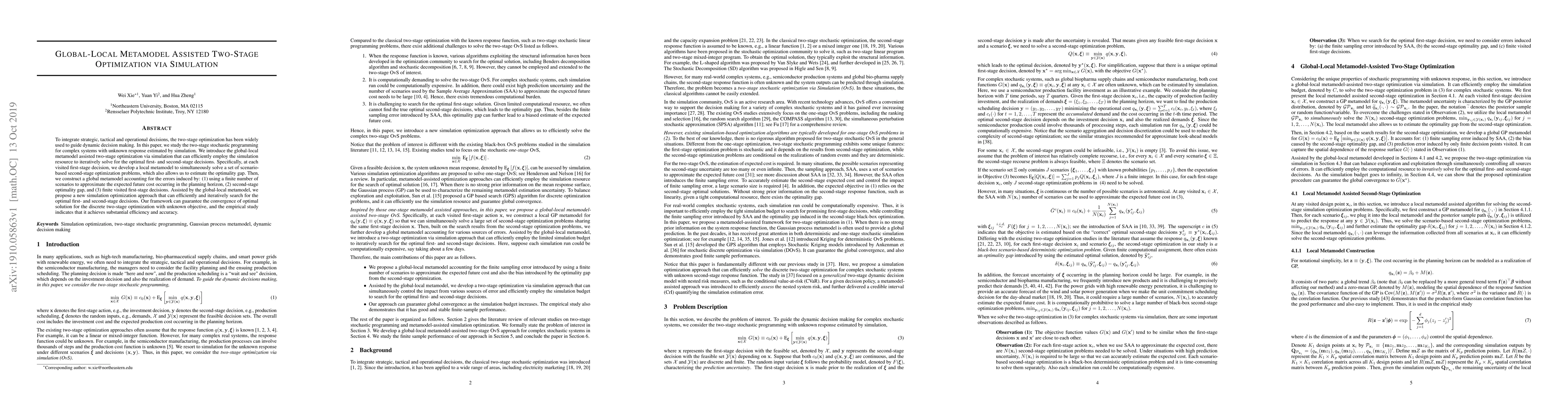 To integrate strategic, tactical and operational decisions, the two-stage optimization has been widely used to guide dynamic decision making. In this paper, we study the two-stage stochastic programming for complex systems with unknown response estimated by simulation. We introduce the global-local metamodel assisted two-stage optimization via simulation that can efficiently employ the simulation resource to iteratively solve for the optimal first- and second-stage decisions. Specifically, at each visited first-stage decision, we develop a local metamodel to simultaneously solve a set of scenario-based second-stage optimization problems, which also allows us to estimate the optimality gap. Then, we construct a global metamodel accounting for the errors induced by: (1) using a finite number of scenarios to approximate the expected future cost occurring in the planning horizon, (2) second-stage optimality gap, and (3) finite visited first-stage decisions. Assisted by the global-local metamodel, we propose a new simulation optimization approach that can efficiently and iteratively search for the optimal first- and second-stage decisions. Our framework can guarantee the convergence of optimal solution for the discrete two-stage optimization with unknown objective, and the empirical study indicates that it achieves substantial efficiency and accuracy.