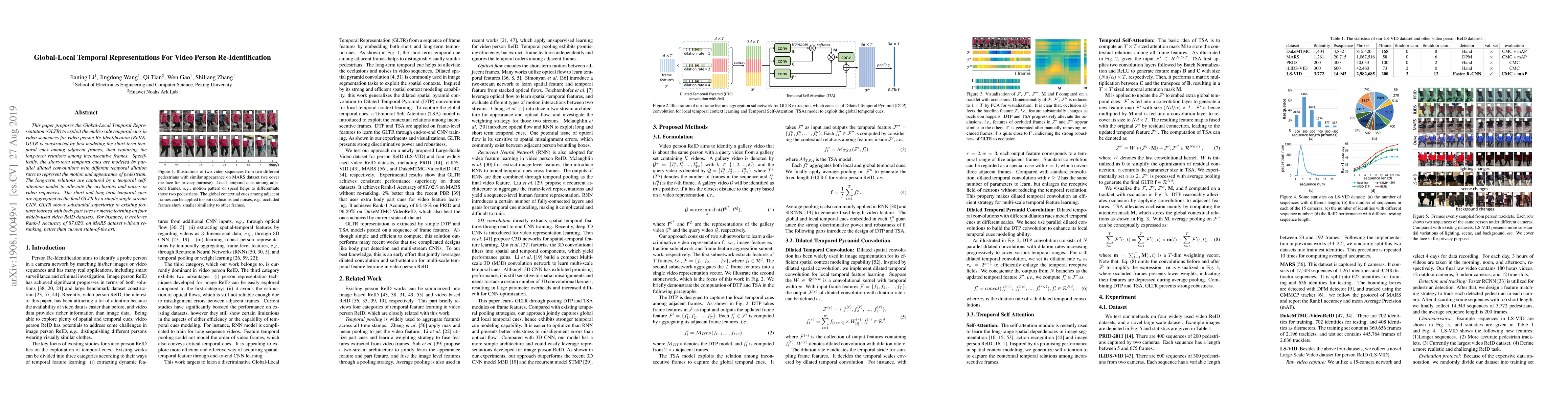 This paper introduces the Global-Local Temporal Representation (GLTR) to enhance video person Re-Identification by leveraging multi-scale temporal cues. It combines short-term temporal modeling with dilated convolutions and long-term temporal self-attention to capture motion and mitigate occlusions, achieving superior performance on ReID datasets.