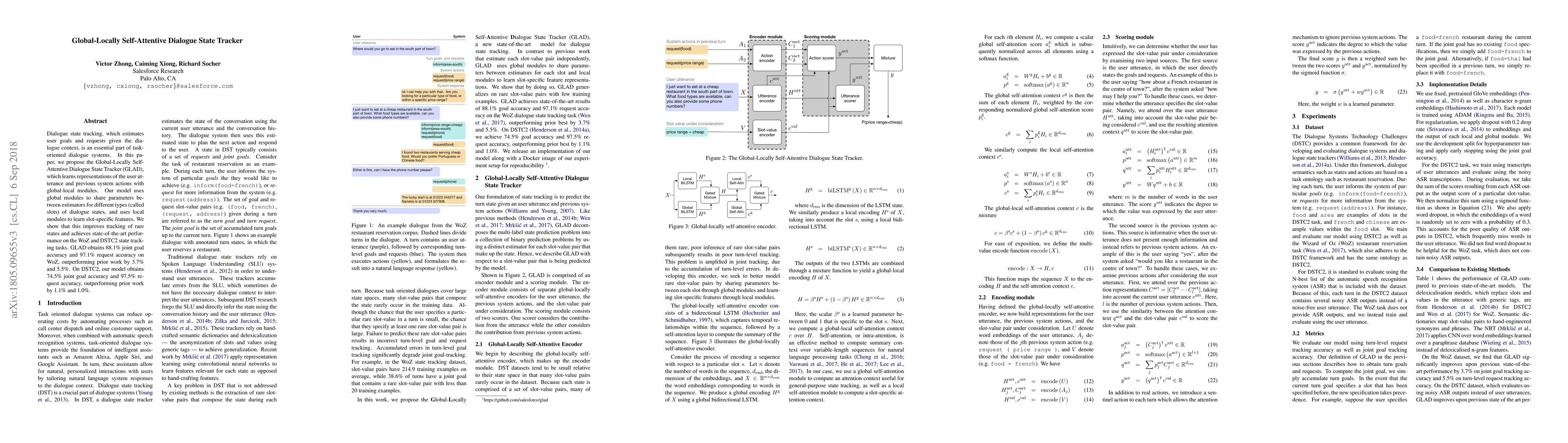 The paper introduces GLAD, a Global-Locally Self-Attentive Dialogue State Tracker that enhances dialogue state tracking by combining global and local modules. GLAD achieves state-of-the-art performance on WoZ and DSTC2 datasets, with notable improvements in tracking rare states.