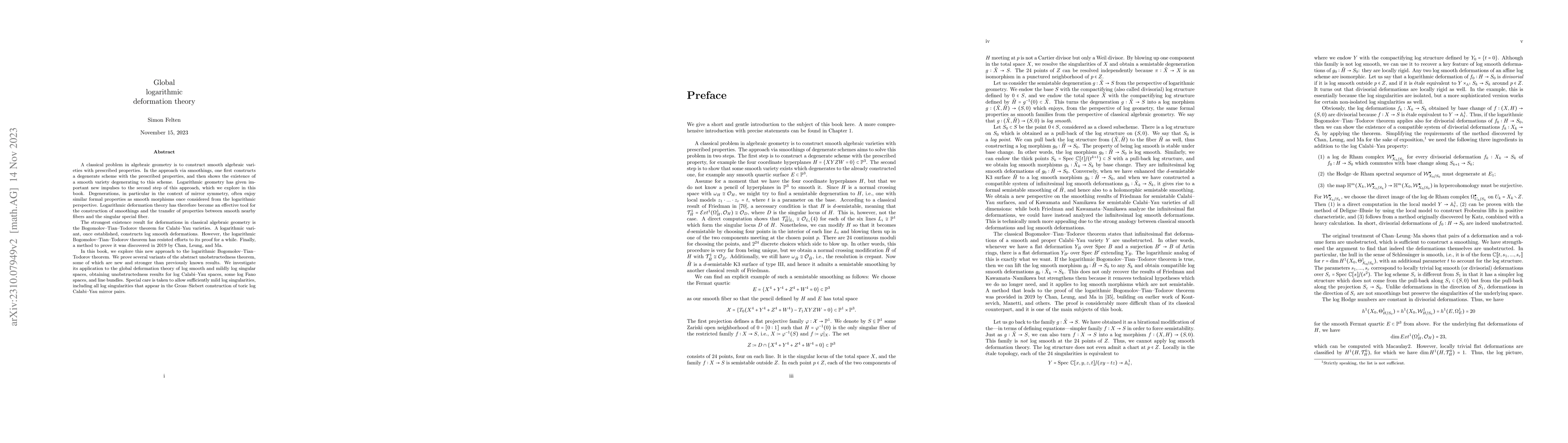A classical problem in algebraic geometry is to construct smooth algebraic varieties with prescribed properties. In the approach via smoothings, one first constructs a degenerate scheme with the prescribed properties, and then shows the existence of a smooth variety degenerating to this scheme. Logarithmic geometry has given important new impulses to the second step of this approach, which we explore in this book. Degenerations, in particular in the context of mirror symmetry, often enjoy similar formal properties as smooth morphisms once considered from the logarithmic perspective. Logarithmic deformation theory has therefore become an effective tool for the construction of smoothings and the transfer of properties between smooth nearby fibers and the singular special fiber. The strongest existence result for deformations in classical algebraic geometry is the Bogomolov--Tian--Todorov theorem for Calabi--Yau varieties. A logarithmic variant, once established, constructs log smooth deformations. However, the logarithmic Bogomolov--Tian--Todorov theorem has resisted efforts to its proof for a while. Finally, a method to prove it was discovered in 2019 by Chan, Leung, and Ma. In this book, we explore this new approach to the logarithmic Bogomolov--Tian--Todorov theorem. We prove several variants of the abstract unobstructedness theorem, some of which are new and stronger than previously known results. We investigate its application to the global deformation theory of log smooth and mildly log singular spaces, obtaining unobstructedness results for log Calabi--Yau spaces, some log Fano spaces, and line bundles. Special care is taken to allow sufficiently mild log singularities, including all log singularities that appear in the Gross--Siebert construction of toric log Calabi--Yau mirror pairs.
