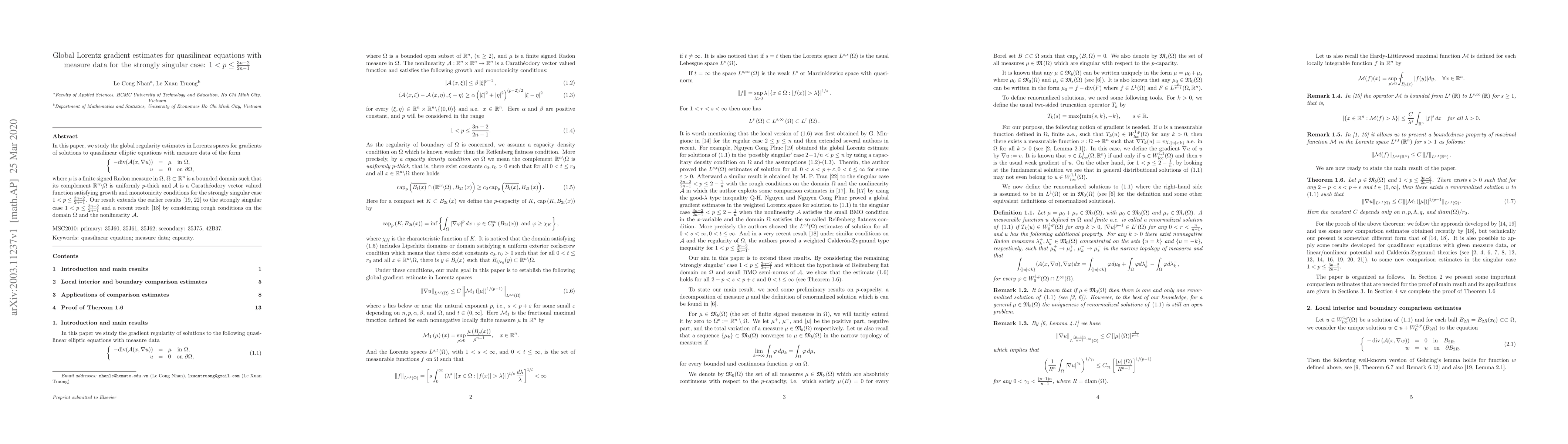 This research extends global regularity estimates for gradients of solutions to quasilinear elliptic equations with measure data to the strongly singular case, where 1<p≤(3n-2)/(2n-1). The study considers rough conditions on the domain and nonlinearity, improving upon previous results.