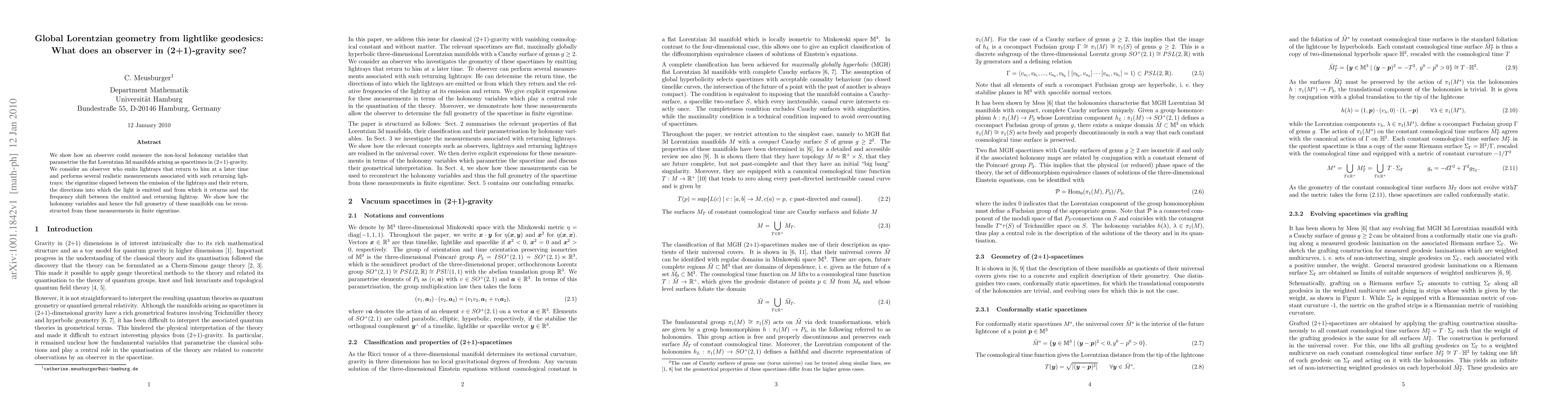 This paper demonstrates how an observer in (2+1)-gravity can measure non-local holonomy variables using returning lightrays to reconstruct the full geometry of flat Lorentzian 3d manifolds, including eigentime elapsed, emission and return directions, and frequency shifts. These measurements allow for the reconstruction of the manifold's geometry in finite eigentime.