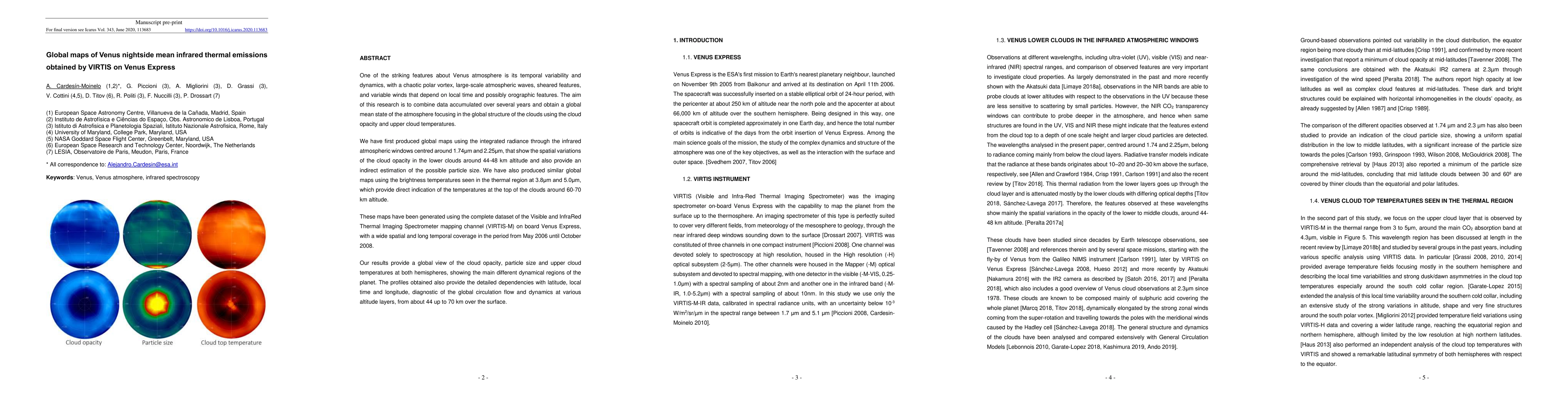 The research utilized data from the VIRTIS instrument onboard Venus Express, mapping the nightside infrared thermal emissions over several years (2006-2008) to derive global mean states of Venus' atmosphere, focusing on cloud opacity and temperatures.