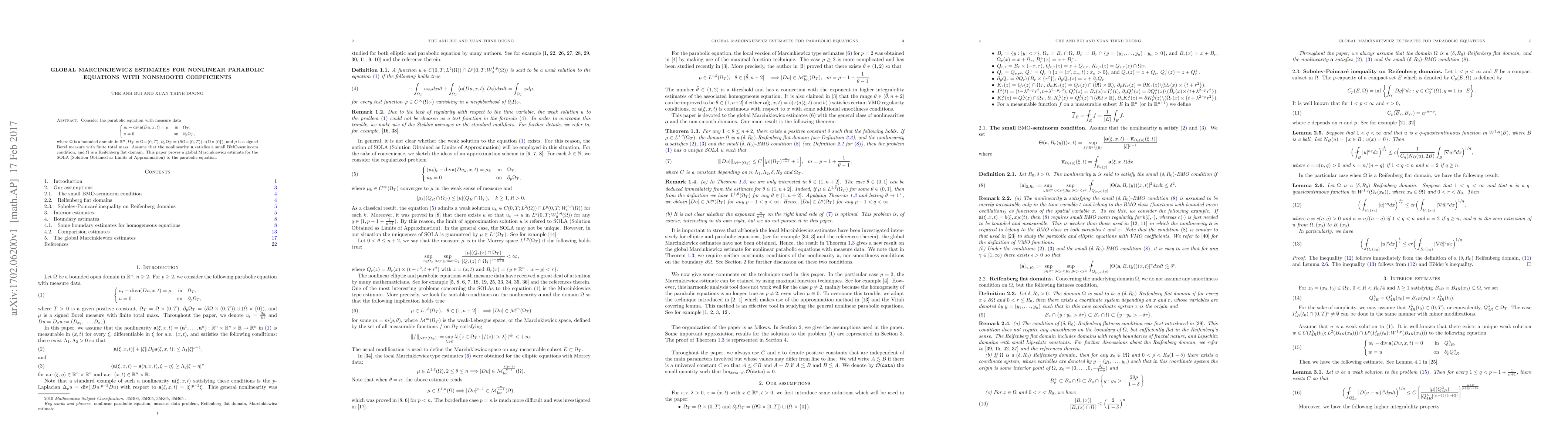 Consider the parabolic equation with measure data \begin{equation*} \left\{ \begin{aligned} &u_t-{\rm div} \mathbf{a}(D u,x,t)=\mu&\text{in}& \quad \Omega_T, &u=0 \quad &\text{on}& \quad \partial_p\Omega_T, \end{aligned}\right. \end{equation*} where $\Omega$ is a bounded domain in $\mathbb{R}^n$, $\Omega_T=\Omega\times (0,T)$, $\partial_p\Omega_T=(\partial\Omega\times (0,T))\cup (\Omega\times\{0\})$, and $\mu$ is a signed Borel measure with finite total mass. Assume that the nonlinearity ${\bf a}$ satisfies a small BMO-seminorm condition, and $\Omega$ is a Reifenberg flat domain. This paper proves a global Marcinkiewicz estimate for the SOLA (Solution Obtained as Limits of Approximation) to the parabolic equation.