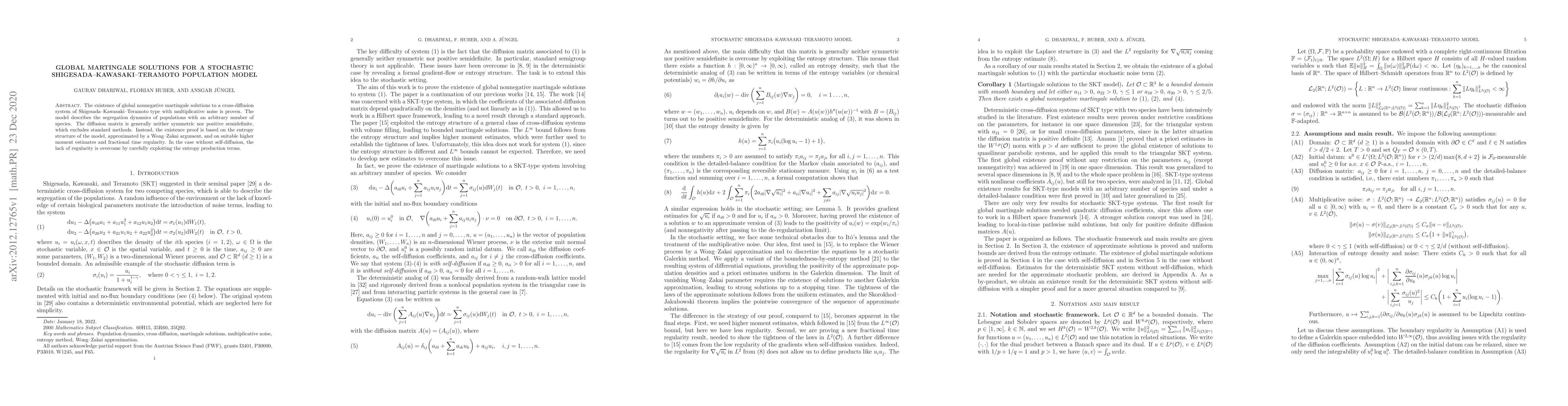 The existence of global nonnegative martingale solutions to a cross-diffusion system of Shigesada-Kawasaki-Teramoto type with multiplicative noise is proven. The model describes the segregation dynamics of populations with an arbitrary number of species. The diffusion matrix is generally neither symmetric nor positive semidefinite, which excludes standard methods. Instead, the existence proof is based on the entropy structure of the model, approximated by a Wong-Zakai argument, and on suitable higher moment estimates and fractional time regularity. In the case without self-diffusion, the lack of regularity is overcome by carefully exploiting the entropy production terms.