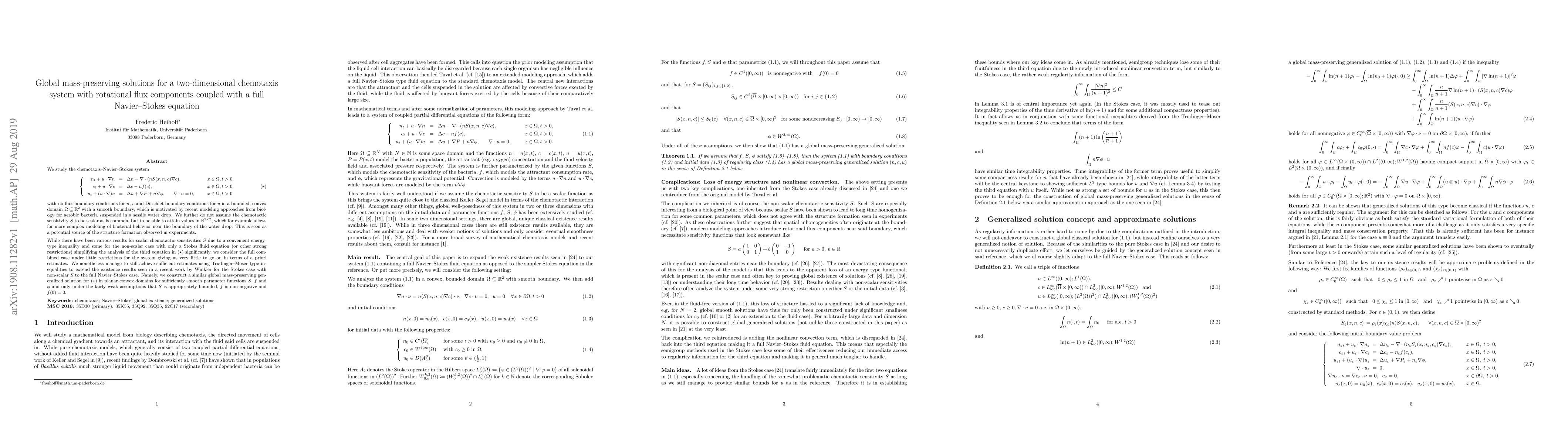 We study the chemotaxis-Navier-Stokes system \[\left\{\; \begin{aligned} n_t + u\cdot\nabla n &=\Delta n - \nabla\cdot (nS(x,n,c)\nabla c), &&x\in\Omega, t > 0, \\ c_t + u\cdot\nabla c &=\Delta c - n f(c), && x\in \Omega, t > 0, \\ u_t + (u\cdot\nabla) u &=\Delta u + \nabla P + n \nabla \phi, \;\;\;\; \nabla\cdot u = 0, && x\in\Omega, t > 0 \end{aligned}\right.\tag{$\star$} \] with no-flux boundary conditions for $n$, $c$ in a bounded, convex domain $\Omega\subseteq\mathbb{R}^2$ with a smooth boundary, which is motivated by recent modeling approaches from biology for aerobic bacteria suspended in a sessile water drop. We further do not assume the chemotactic sensitivity $S$ to be scalar as is common, but to be able to attain values in $\mathbb{R}^{2\times 2}$, which allows for more complex modeling of bacterial behavior near the boundary. This is seen as a potential source of the structure formation observed in experiments. While there have been various results for scalar chemotactic sensitivities $S$ due to a convenient energy-type inequality and some for the non-scalar case with only a Stokes fluid equation (or other strong restrictions) simplifying the analysis of the third equation in ($\star$) significantly, we consider the full combined case under little restrictions for the system giving us very little to go on in terms of a priori estimates. We nonetheless manage to still achieve sufficient estimates using Trudinger-Moser type inequalities to extend the existence results seen in a recent work by Winkler for the Stokes case with non-scalar $S$ to the full Navier-Stokes case. Namely, we construct a similar global mass-preserving generalized solution for ($\star$) in planar convex domains for sufficiently smooth parameter functions $S$, $f$ and $\phi$ and only under the fairly weak assumptions that $S$ is appropriately bounded, $f$ is non-negative and $f(0) = 0$.