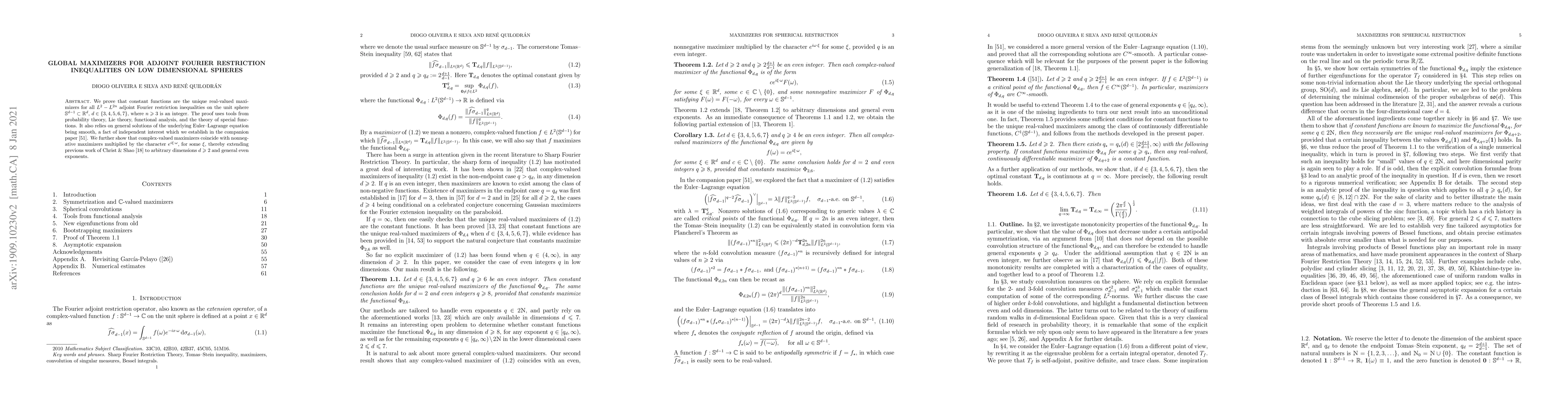 We prove that constant functions are the unique real-valued maximizers for all $L^2-L^{2n}$ adjoint Fourier restriction inequalities on the unit sphere $\mathbb{S}^{d-1}\subset\mathbb{R}^d$, $d\in\{3,4,5,6,7\}$, where $n\geq 3$ is an integer. The proof uses tools from probability theory, Lie theory, functional analysis, and the theory of special functions. It also relies on general solutions of the underlying Euler-Lagrange equation being smooth, a fact of independent interest which we establish in a companion paper. We further show that complex-valued maximizers coincide with nonnegative maximizers multiplied by the character $e^{i\xi\cdot\omega}$, for some $\xi$, thereby extending previous work of Christ & Shao to arbitrary dimensions $d\geq 2$ and general even exponents.
