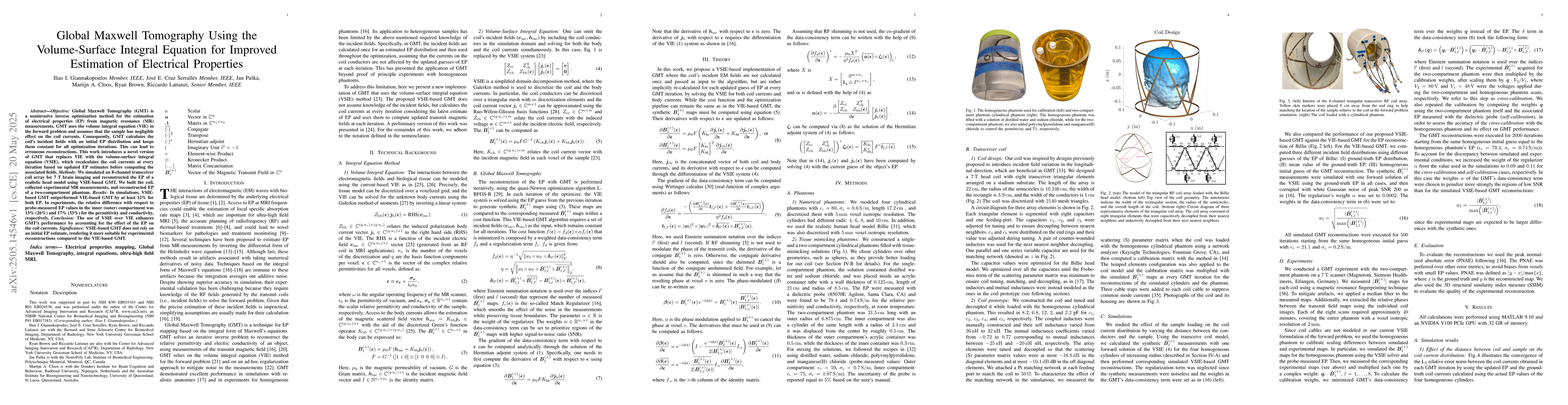 Objective: Global Maxwell Tomography (GMT) is a noninvasive inverse optimization method for the estimation of electrical properties (EP) from magnetic resonance (MR) measurements. GMT uses the volume integral equation (VIE) in the forward problem and assumes that the sample has negligible effect on the coil currents. Consequently, GMT calculates the coil's incident fields with an initial EP distribution and keeps them constant for all optimization iterations. This can lead to erroneous reconstructions. This work introduces a novel version of GMT that replaces VIE with the volume-surface integral equation (VSIE), which recalculates the coil currents at every iteration based on updated EP estimates before computing the associated fields. Methods: We simulated an 8-channel transceiver coil array for 7 T brain imaging and reconstructed the EP of a realistic head model using VSIE-based GMT. We built the coil, collected experimental MR measurements, and reconstructed EP of a two-compartment phantom. Results: In simulations, VSIE-based GMT outperformed VIE-based GMT by at least 12% for both EP. In experiments, the relative difference with respect to probe-measured EP values in the inner (outer) compartment was 13% (26%) and 17% (33%) for the permittivity and conductivity, respectively. Conclusion: The use of VSIE over VIE enhances GMT's performance by accounting for the effect of the EP on the coil currents. Significance: VSIE-based GMT does not rely on an initial EP estimate, rendering it more suitable for experimental reconstructions compared to the VIE-based GMT.