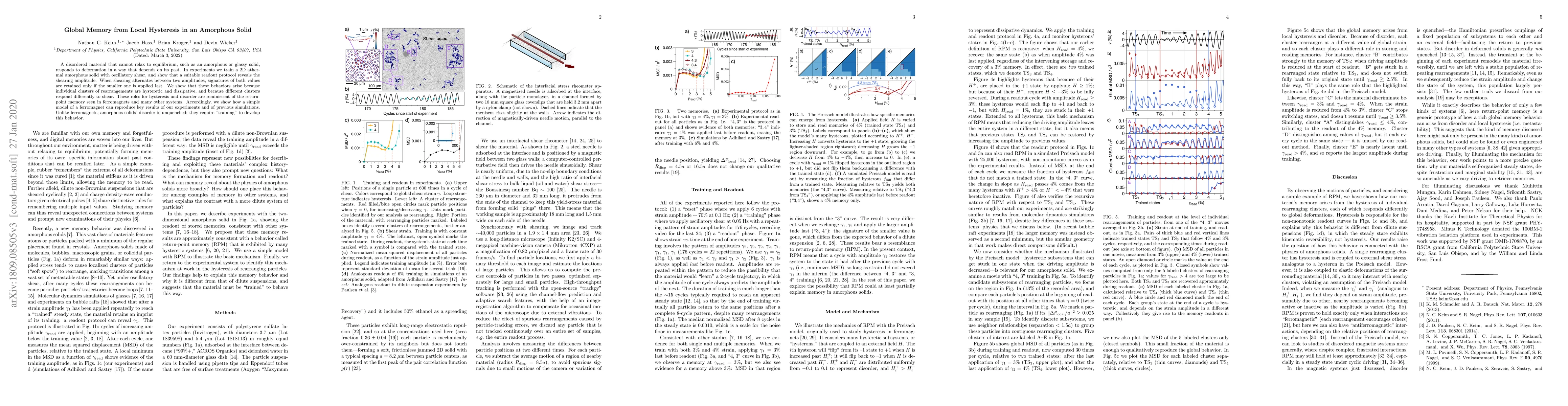 A disordered material that cannot relax to equilibrium, such as an amorphous or glassy solid, responds to deformation in a way that depends on its past. In experiments we train a 2D athermal amorphous solid with oscillatory shear, and show that a suitable readout protocol reveals the shearing amplitude. When shearing alternates between two amplitudes, signatures of both values are retained only if the smaller one is applied last. We show that these behaviors arise because individual clusters of rearrangements are hysteretic and dissipative, and because different clusters respond differently to shear. These roles for hysteresis and disorder are reminiscent of the return-point memory seen in ferromagnets and many other systems. Accordingly, we show how a simple model of a ferromagnet can reproduce key results of our experiments and of previous simulations. Unlike ferromagnets, amorphous solids' disorder is unquenched; they require "training" to develop this behavior.