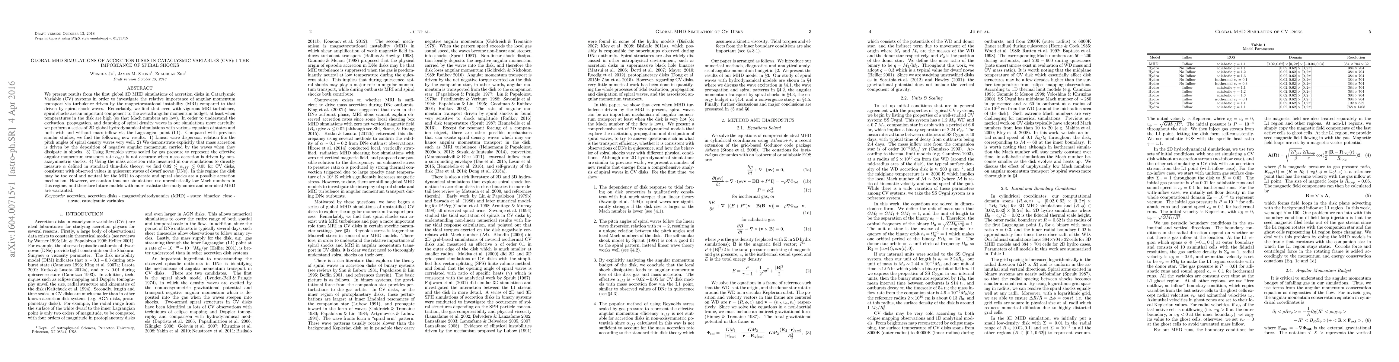 This paper presents the first global 3D MHD simulations of accretion disks in Cataclysmic Variables (CVs), revealing the significant role of spiral shock waves in angular momentum transport, even when MRI turbulence is active. The study highlights the importance of spiral shocks in high-temperature disks and suggests that future models should incorporate more realistic thermodynamics and non-ideal MHD.