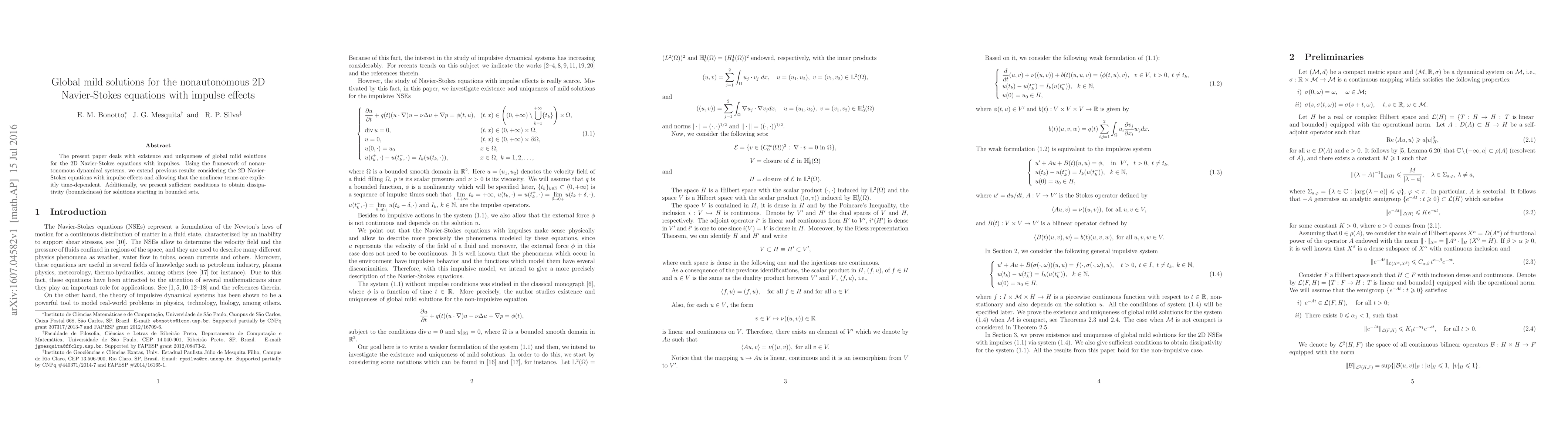 This paper investigates the existence and uniqueness of global mild solutions for nonautonomous 2D Navier-Stokes equations under impulse effects, extending previous results by allowing explicitly time-dependent nonlinear terms and providing conditions for solution boundedness.