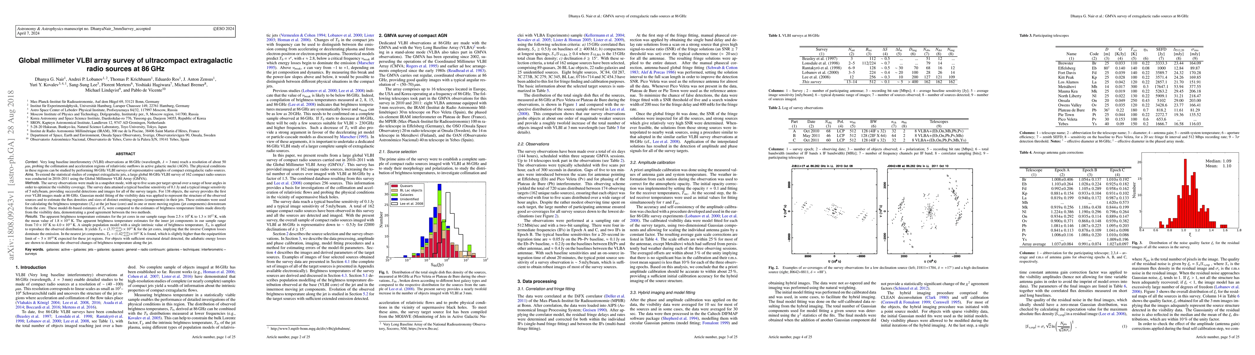 (abridged) Very long baseline interferometry (VLBI) observations at 86$\,$GHz (wavelength, $\lambda = 3\,$mm) reach a resolution of about 50 $\mu$as, probing the collimation and acceleration regions of relativistic outflows in active galactic nuclei. To extend the statistical studies of compact extragalactic jets, a large global 86 GHz VLBI survey of 162 radio sources was conducted in 2010-2011 using the Global Millimeter VLBI Array. The survey data attained a typical baseline sensitivity of 0.1 Jy and a typical image sensitivity of 5 mJy/beam, providing successful detections and images for all of the survey targets. For 138 objects, the survey provides the first ever VLBI images made at 86 GHz. Gaussian model fitting of the visibility data was applied to represent the structure of the sources. The Gaussian model-fit-based estimates of brightness temperature ($T_\mathrm{b}$) at the jet base (core) and in moving regions (jet components) downstream from the core were compared to the estimates of $T_\mathrm{b}$ limits made directly from the visibility data, demonstrating a good agreement between the two methods. The apparent brightness temperature estimates for the jet cores in our sample range from $2.5 \times 10^{9}\,$K to $ 1.3\times 10^{12}\,$K. A population model with a single intrinsic value of brightness temperature, $T_\mathrm{0}$, is applied to reproduce the observed $T_\mathrm{b}$ distribution. It yields $T_\mathrm{0} = (3.77^{+0.10}_{-0.14}) \times 10^{11}\,$K for the jet cores, implying that the inverse Compton losses dominate the emission. In the jet components, $T_\mathrm{0} =(1.42^{+0.16}_{-0.19})\times 10^{11}\,$K is found, slightly higher than the equipartition limit of $\sim5\times 10^{10}\,$K expected for these jet regions. For objects with sufficient structural detail detected, the adiabatic energy losses dominate the observed changes of $T_\mathrm{b}$ along the jet.