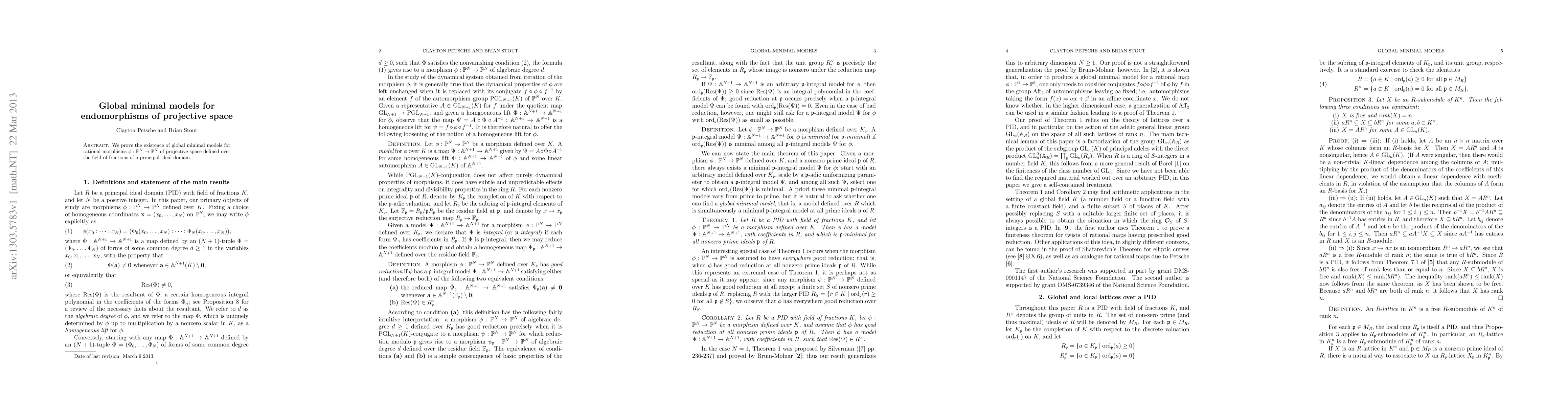 We prove the existence of global minimal models for rational morphisms $\phi:{\mathbb P}^N\rightarrow{\mathbb P}^N$ of projective space defined over the field of fractions of a principal ideal domain.