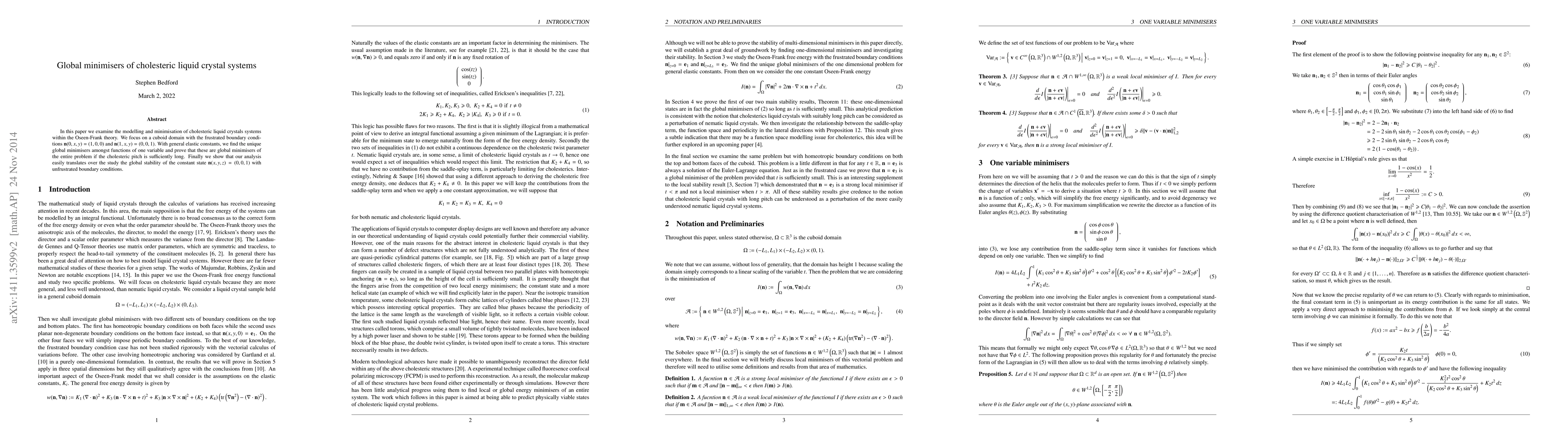 This paper models and minimizes cholesteric liquid crystal systems using the Oseen-Frank theory, focusing on a cuboid domain with specific boundary conditions. It identifies unique global minimizers for functions of one variable and proves their global optimality under long cholesteric pitch conditions, while also extending the analysis to the stability of a constant state.