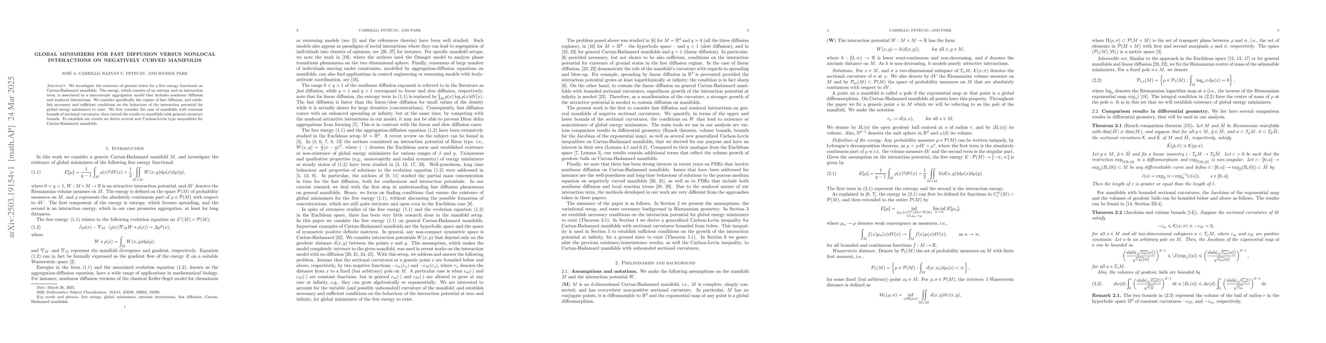 The research employs analysis of a free energy functional on Cartan-Hadamard manifolds, deriving new Carlson-Levin type inequalities to establish conditions for global energy minimizers in fast diffusion regimes with varying curvature bounds.