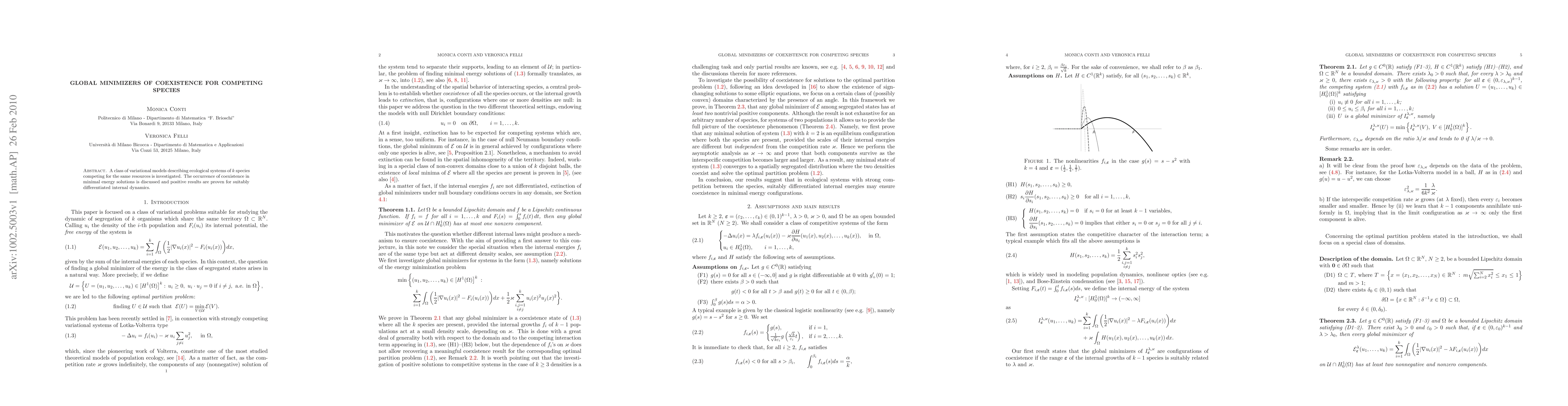 This paper investigates variational models for ecological systems of k competing species, proving the existence of global minimizers that allow coexistence in minimal energy solutions under specific internal dynamics conditions.