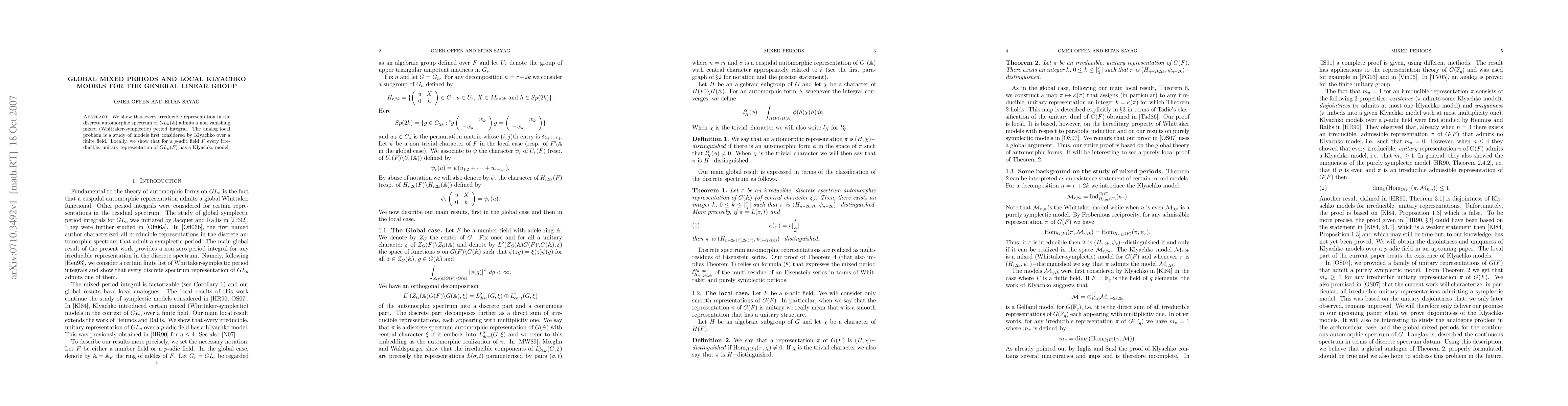 The paper proves that all irreducible representations in GL(n)'s discrete automorphic spectrum have non-vanishing mixed period integrals globally, linking to Klyachko's local models. Locally, it's shown that every irreducible, unitary representation of GL(n,F) for a p-adic field F has a Klyachko model.