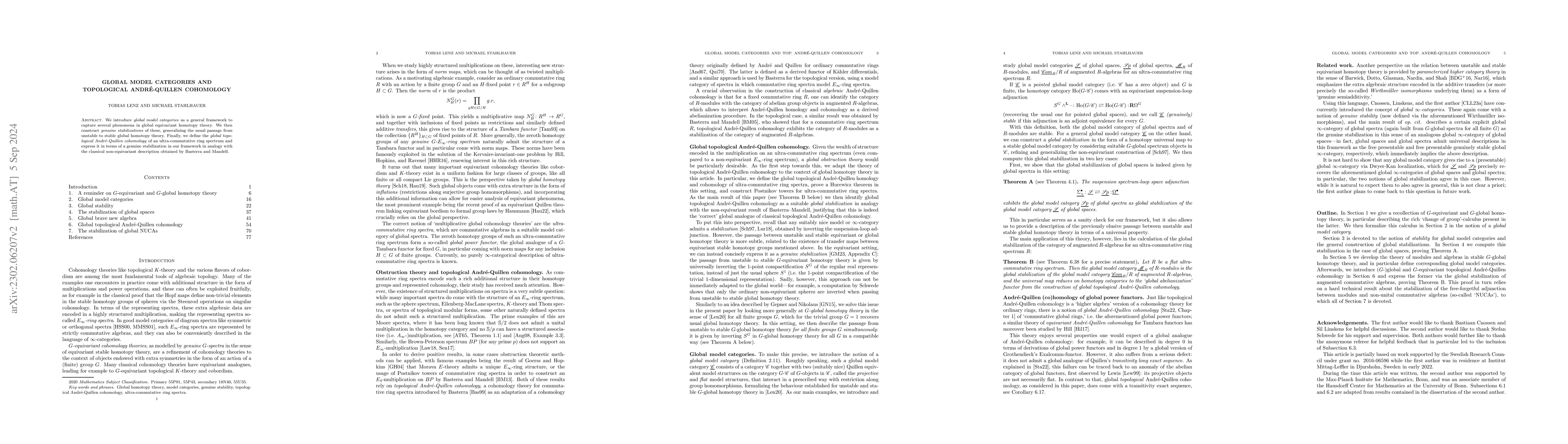This paper develops global model categories to study phenomena in global equivariant homotopy theory, constructs stabilizations to transition from unstable to stable homotopy theory, and defines global topological Andr\'e-Quillen cohomology for ultra-commutative ring spectra, relating it to stabilizations.