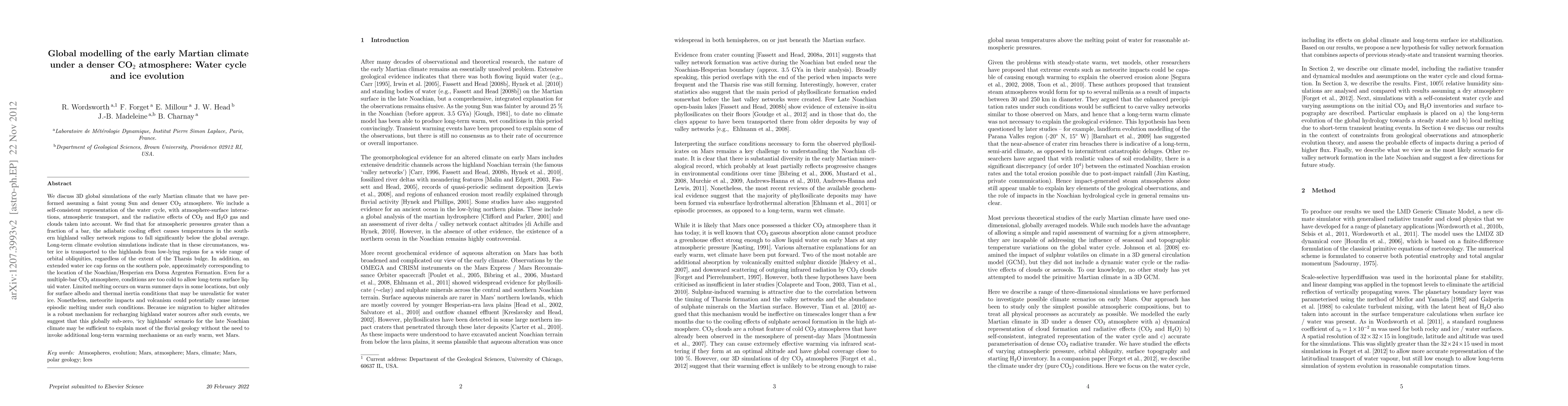 This study uses 3D global climate simulations to model the early Martian climate under a denser CO2 atmosphere, finding that ice migrates to highland regions due to adiabatic cooling, forming an extended ice cap in the southern hemisphere. Despite the presence of a CO2 atmosphere, long-term surface liquid water is unlikely, suggesting an "icy highlands" scenario could explain fluvial geology without invoking additional warming mechanisms.