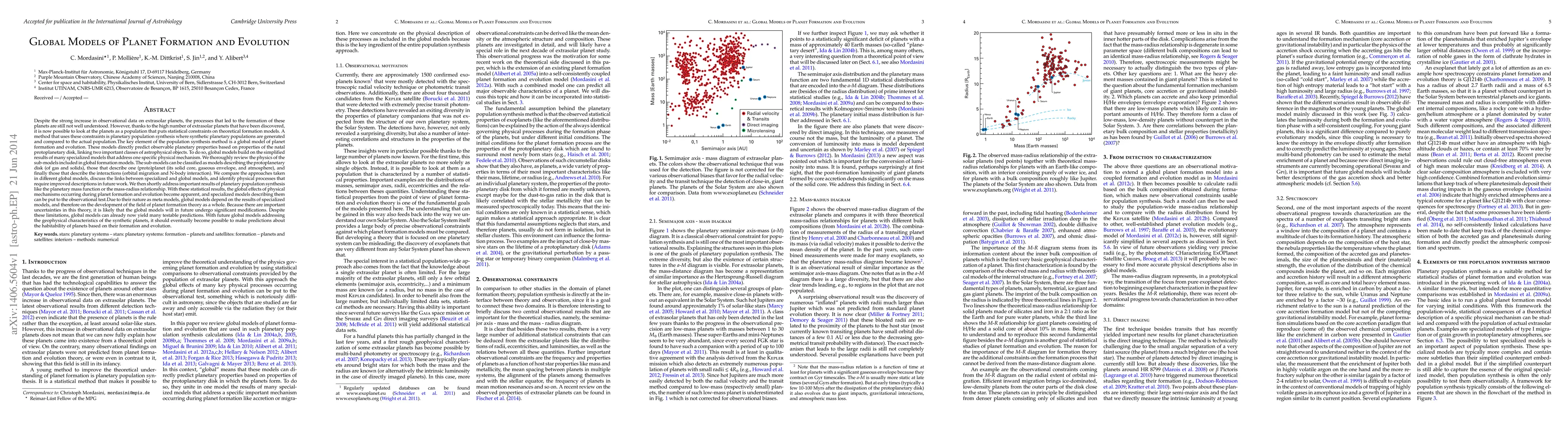 This paper reviews global models of planet formation and evolution, emphasizing their use in planetary population synthesis to predict observable planetary properties. It discusses the sub-models that describe protoplanetary disks, planets, and their interactions, comparing different global models and identifying areas needing improved physical descriptions. The paper highlights results like the planetary mass function and mass-radius relation, which reveal the global effects of formation processes and can be tested against observations.