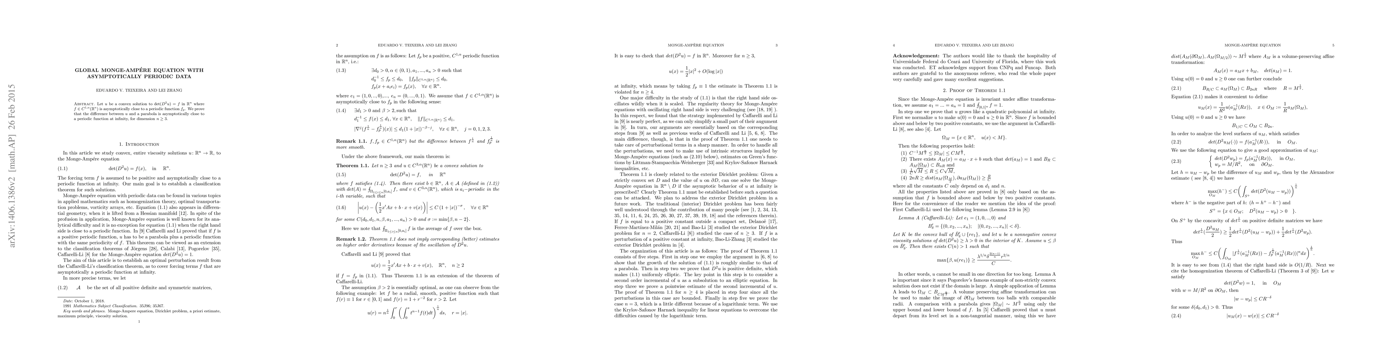 Let $u$ be a convex solution to $\det(D^2u)=f$ in $\mathbb R^n$ where $f\in C^{1,\alpha}(\mathbb R^n)$ is asymptotically close to a periodic function $f_p$. We prove that the difference between $u$ and a parabola is asymptotically close to a periodic function at infinity, for dimension $n\ge 3$.