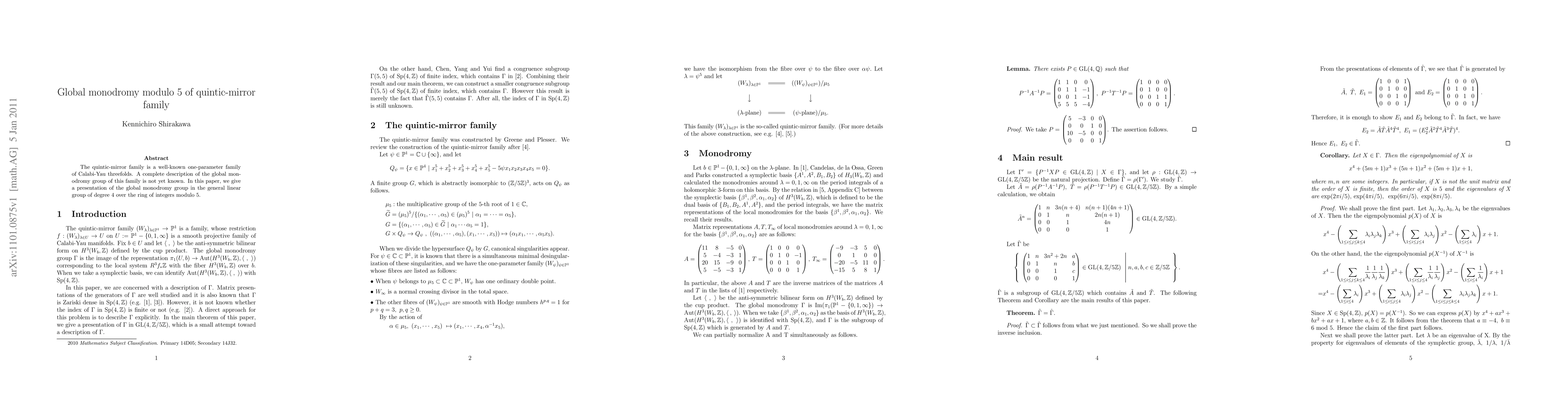 This paper presents a detailed exploration of the global monodromy group of the quintic-mirror family of Calabi-Yau threefolds, providing a specific representation of this group within the general linear group of degree 4 over the integers modulo 5. The study contributes to understanding the complex geometric structures within these mathematical models.
