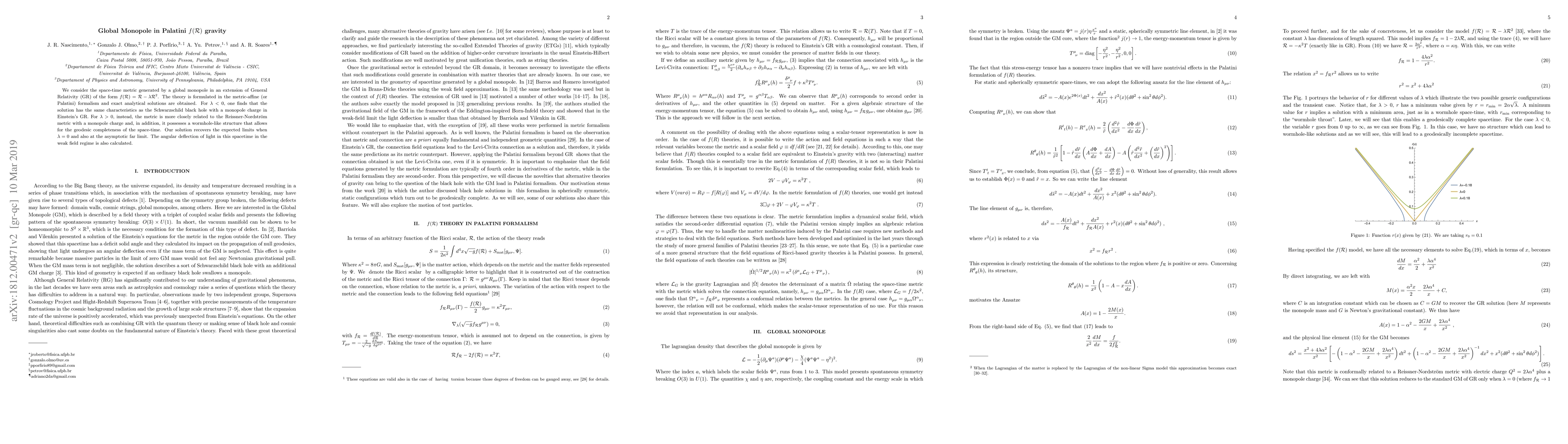 We consider the space-time metric generated by a global monopole in an extension of General Relativity (GR) of the form $f(\mathcal{R})=\mathcal{R}-\lambda \mathcal{R}^2$. The theory is formulated in the metric-affine (or Palatini) formalism and exact analytical solutions are obtained. For $\lambda<0$, one finds that the solution has the same characteristics as the Schwarzschild black hole with a monopole charge in Einstein's GR. For $\lambda>0$, instead, the metric is more closely related to the Reissner-Nordstr\"{o}m metric with a monopole charge and, in addition, it possesses a wormhole-like structure that allows for the geodesic completeness of the space-time. Our solution recovers the expected limits when $\lambda=0$ and also at the asymptotic far limit. The angular deflection of light in this spacetime in the weak field regime is also calculated.