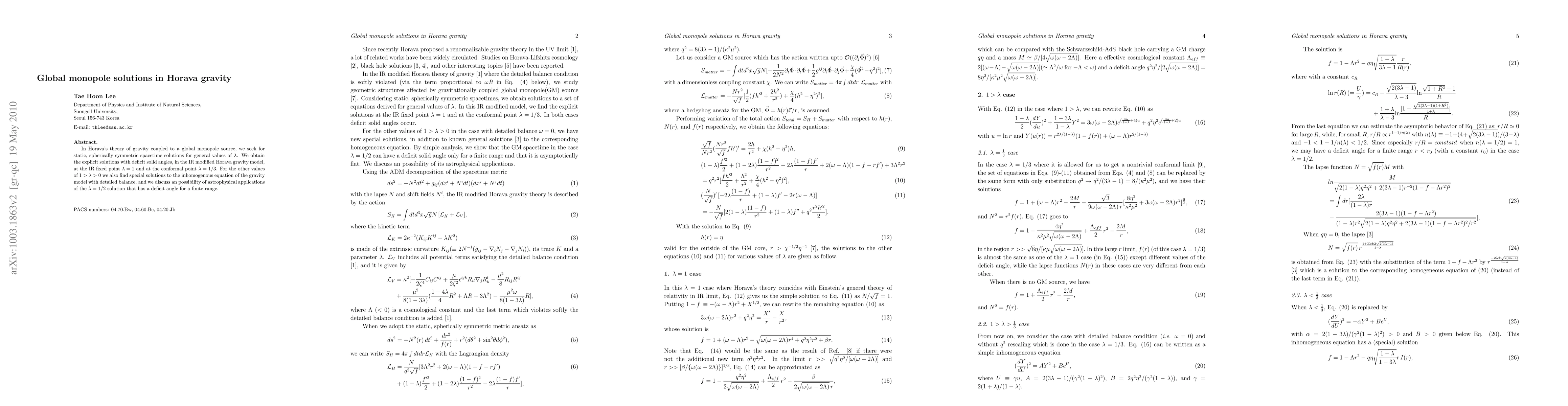 In Horava's theory of gravity coupled to a global monopole source, we seek for static, spherically symmetric spacetime solutions for general values of $\lambda$. We obtain the explicit solutions with deficit solid angles, in the IR modified Horava gravity model, at the IR fixed point $\lambda=1$ and at the conformal point $\lambda=1/3$. For the other values of $1>\lambda>0$ we also find special solutions to the inhomogenous equation of the gravity model with detailed balance, and we discuss an possibility of astrophysical applications of the $\lambda=1/2$ solution that has a deficit angle for a finite range.