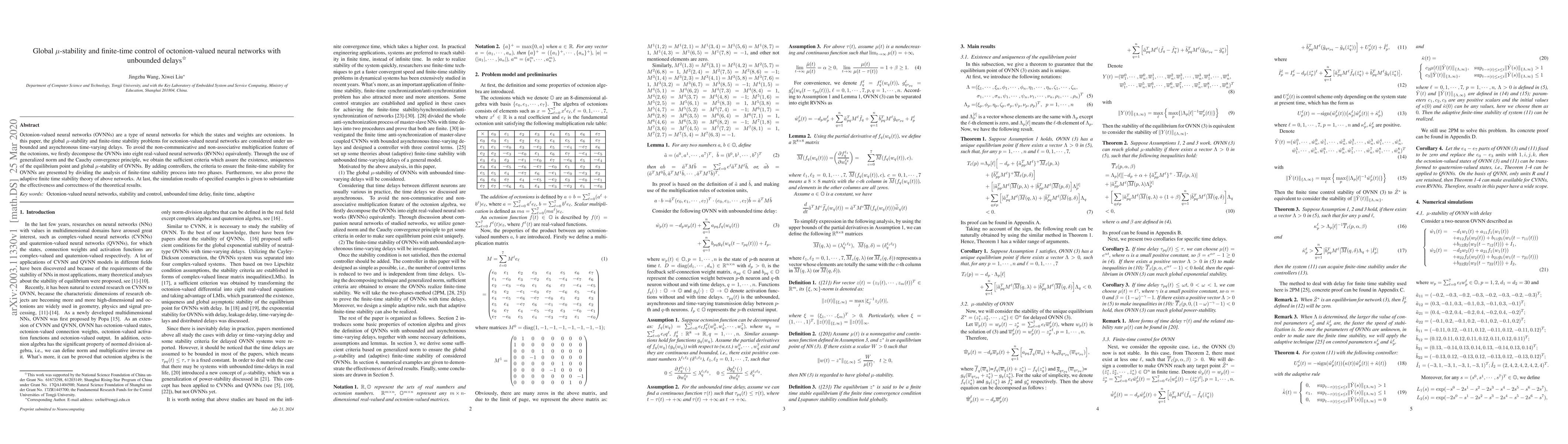 This paper investigates global $\mu$-stability and finite-time control of octonion-valued neural networks (OVNNs) with unbounded delays, decomposing them into eight real-valued neural networks for analysis. It provides sufficient criteria for equilibrium existence, uniqueness, and stability, and presents adaptive finite-time stability theory, validated by simulation examples.