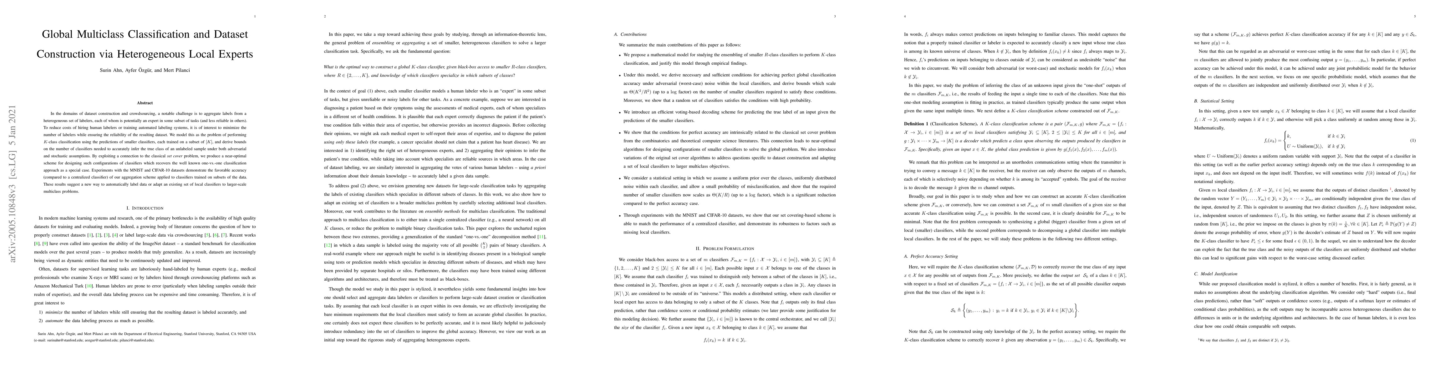 In the domains of dataset construction and crowdsourcing, a notable challenge is to aggregate labels from a heterogeneous set of labelers, each of whom is potentially an expert in some subset of tasks (and less reliable in others). To reduce costs of hiring human labelers or training automated labeling systems, it is of interest to minimize the number of labelers while ensuring the reliability of the resulting dataset. We model this as the problem of performing $K$-class classification using the predictions of smaller classifiers, each trained on a subset of $[K]$, and derive bounds on the number of classifiers needed to accurately infer the true class of an unlabeled sample under both adversarial and stochastic assumptions. By exploiting a connection to the classical set cover problem, we produce a near-optimal scheme for designing such configurations of classifiers which recovers the well known one-vs.-one classification approach as a special case. Experiments with the MNIST and CIFAR-10 datasets demonstrate the favorable accuracy (compared to a centralized classifier) of our aggregation scheme applied to classifiers trained on subsets of the data. These results suggest a new way to automatically label data or adapt an existing set of local classifiers to larger-scale multiclass problems.
