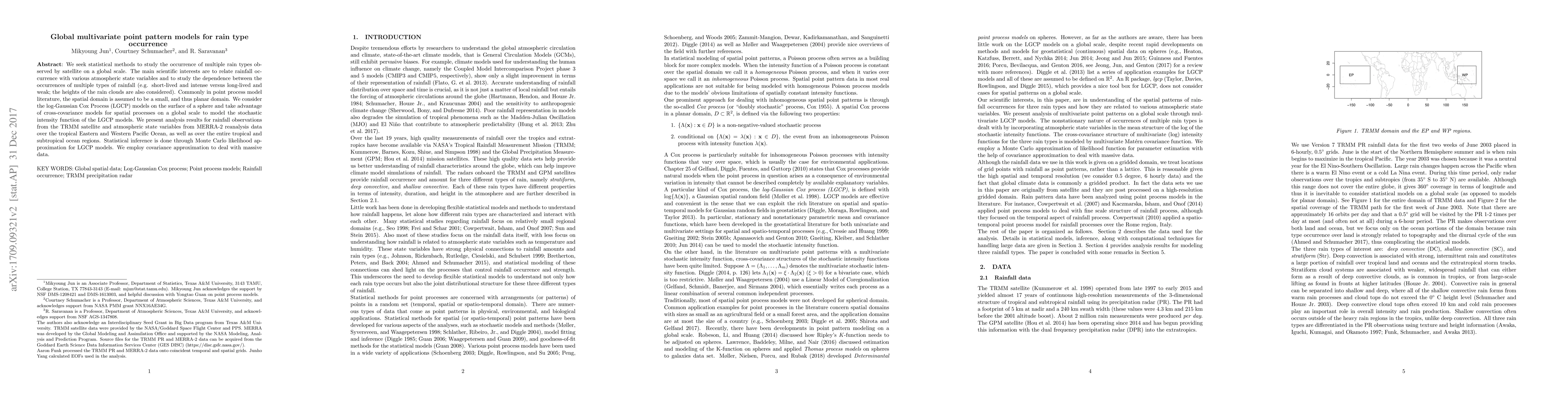 We seek statistical methods to study the occurrence of multiple rain types observed by satellite on a global scale. The main scientific interests are to relate rainfall occurrence with various atmospheric state variables and to study the dependence between the occurrences of multiple types of rainfall (e.g. short-lived and intense versus long-lived and weak; the heights of the rain clouds are also considered). Commonly in point process model literature, the spatial domain is assumed to be a small, and thus planar domain. We consider the log-Gaussian Cox Process (LGCP) models on the surface of a sphere and take advantage of cross-covariance models for spatial processes on a global scale to model the stochastic intensity function of the LGCP models. We present analysis results for rainfall observations from the TRMM satellite and atmospheric state variables from MERRA-2 reanalysis data over the tropical Eastern and Western Pacific Ocean, as well as over the entire tropical and subtropical ocean regions. Statistical inference is done through Monte Carlo likelihood approximation for LGCP models. We employ covariance approximation to deal with massive data.