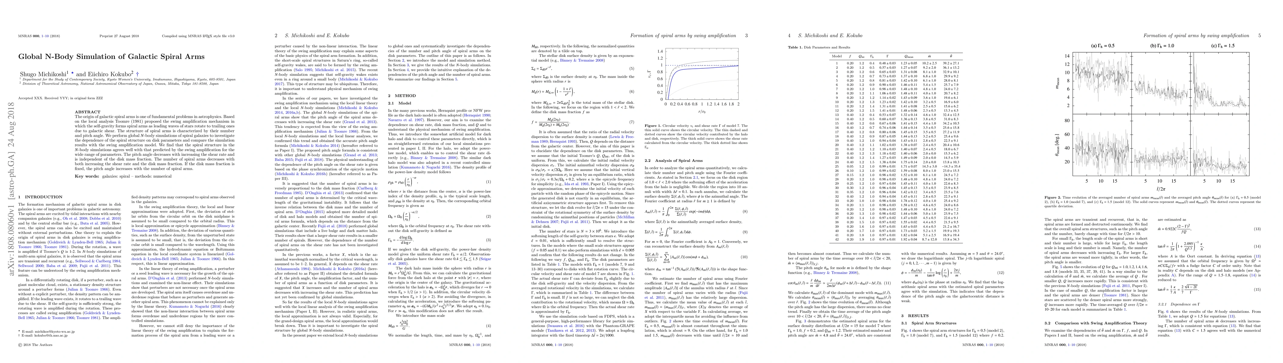This research conducts global $N$-body simulations of spiral galaxies to explore the formation of spiral arms, confirming that the swing amplification mechanism well explains the observed spiral structures. The simulations show that pitch angle decreases with higher shear rates and is unaffected by disk mass, while the number of arms decreases with higher shear rates and disk mass.