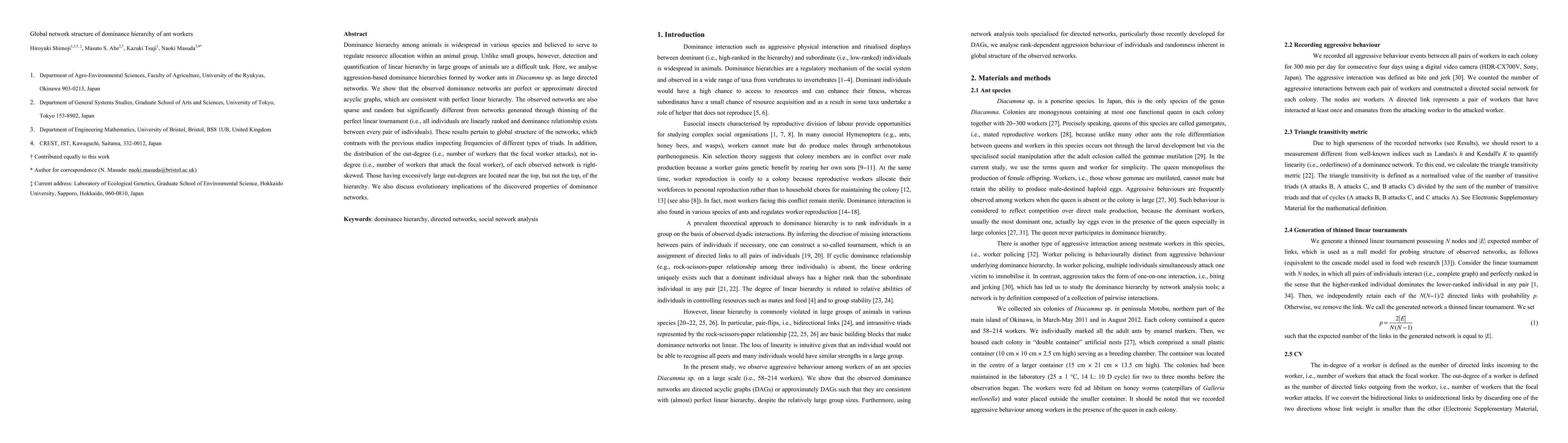 Dominance hierarchy among animals is widespread in various species and believed to serve to regulate resource allocation within an animal group. Unlike small groups, however, detection and quantification of linear hierarchy in large groups of animals are a difficult task. Here, we analyse aggression-based dominance hierarchies formed by worker ants in Diacamma sp. as large directed networks. We show that the observed dominance networks are perfect or approximate directed acyclic graphs, which are consistent with perfect linear hierarchy. The observed networks are also sparse and random but significantly different from networks generated through thinning of the perfect linear tournament (i.e., all individuals are linearly ranked and dominance relationship exists between every pair of individuals). These results pertain to global structure of the networks, which contrasts with the previous studies inspecting frequencies of different types of triads. In addition, the distribution of the out-degree (i.e., number of workers that the focal worker attacks), not in-degree (i.e., number of workers that attack the focal worker), of each observed network is right-skewed. Those having excessively large out-degrees are located near the top, but not the top, of the hierarchy. We also discuss evolutionary implications of the discovered properties of dominance networks.
