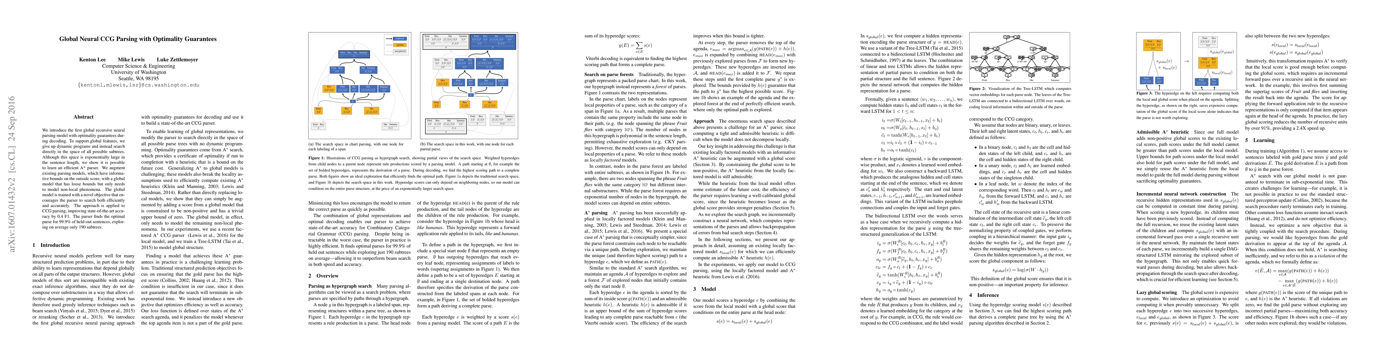 This paper presents a global neural CCG parser with optimality guarantees, achieving state-of-the-art accuracy by exploring a small fraction of the exponentially large subtree space using an efficient A* parser. The model improves F1 score by 0.4 and finds optimal parses for nearly all sentences.