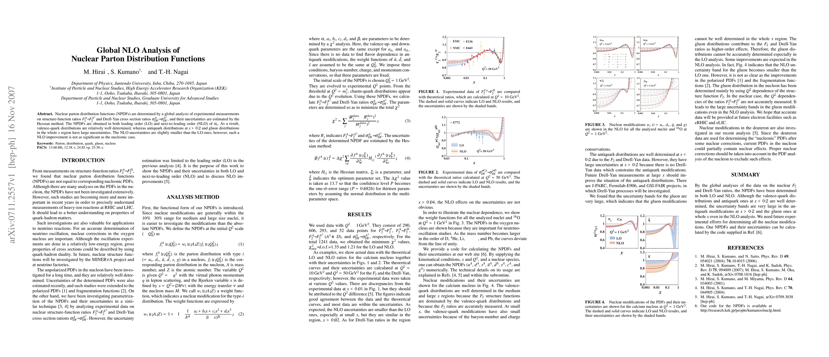 This paper presents a global analysis of nuclear parton distribution functions (NPDFs) using experimental data and the Hessian method to estimate uncertainties. Both leading order (LO) and next-to-leading order (NLO) calculations are performed, showing better determination of valence quarks but large uncertainties in antiquark and gluon distributions. NLO uncertainties are slightly smaller than LO but less significant than in nucleonic cases.