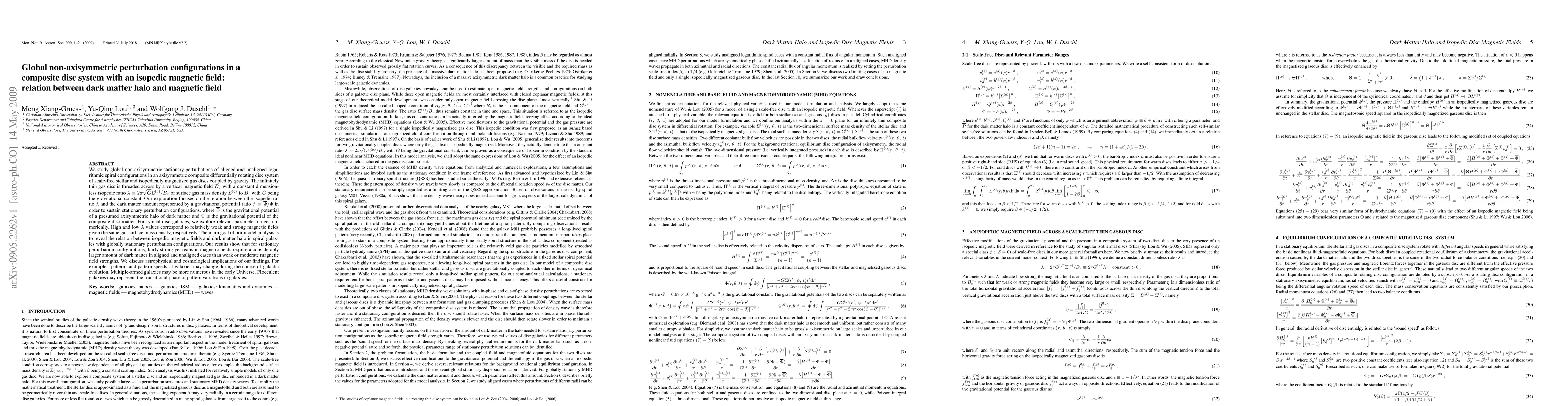 We study global non-axisymmetric stationary perturbations of aligned and unaligned logarithmic spiral configurations in an axisymmetric composite differentially rotating disc system of scale-free stellar and isopedically magnetized gas discs coupled by gravity. The gas disc is threaded across by a vertical magnetic field $B_z$ with a constant dimensionless isopedic ratio $\lambda\equiv 2\pi\sqrt{G} \Sigma^{(g)}/B_z$ of surface gas mass density $\Sigma^{(g)}$ to $B_z$ with $G$ being the gravitational constant. Our exploration focuses on the relation between $\lambda$ and the dark matter amount represented by a ratio $f\equiv\bar{\Phi}/\Phi$ in order to sustain stationary perturbation configurations, where $\bar{\Phi}$ is the gravitational potential of a presumed axisymmetric halo of dark matter and $\Phi$ is the gravitational potential of the composite disc matter. High and low $\lambda$ values correspond to relatively weak and strong magnetic fields given the same gas surface mass density, respectively. The main goal of our model analysis is to reveal the relation between isopedic magnetic fields and dark matter halo in spiral galaxies with globally stationary perturbation configurations. Our results show that, fairly strong yet realistic magnetic fields require a considerably larger amount of dark matter in aligned and unaligned cases than weak or moderate magnetic field strengths. We discuss astrophysical and cosmological implications of our findings. For examples, patterns and pattern speeds of galaxies may change during the course of galactic evolution. Multiple-armed galaxies may be more numerous in the early Universe. Flocculent galaxies may represent the transitional phase of pattern variations in galaxies.