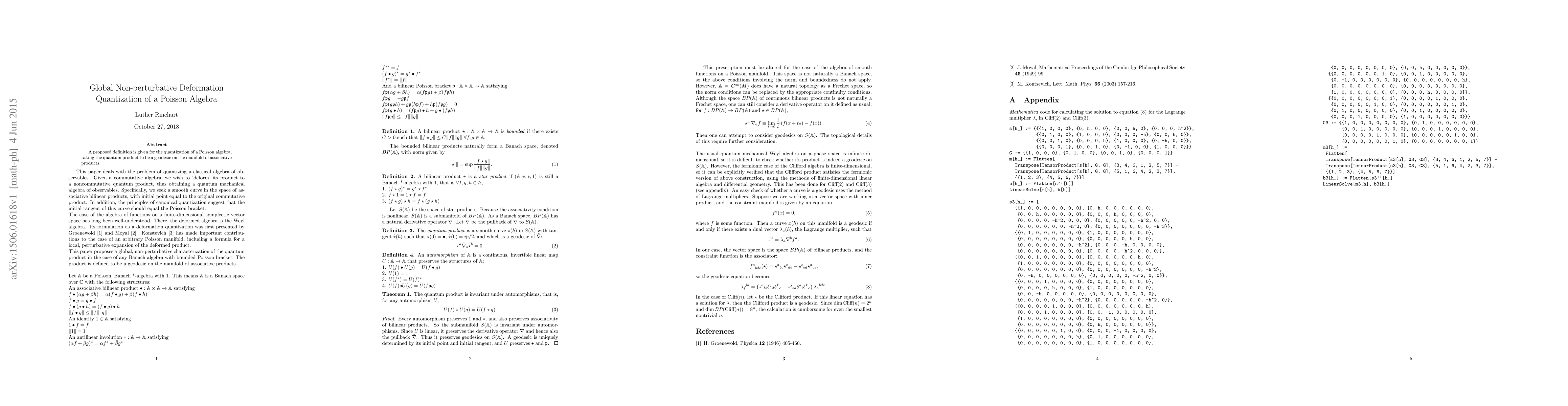 A proposed definition is given for the quantization of a Poisson algebra, taking the quantum product to be a geodesic on the manifold of associative products.