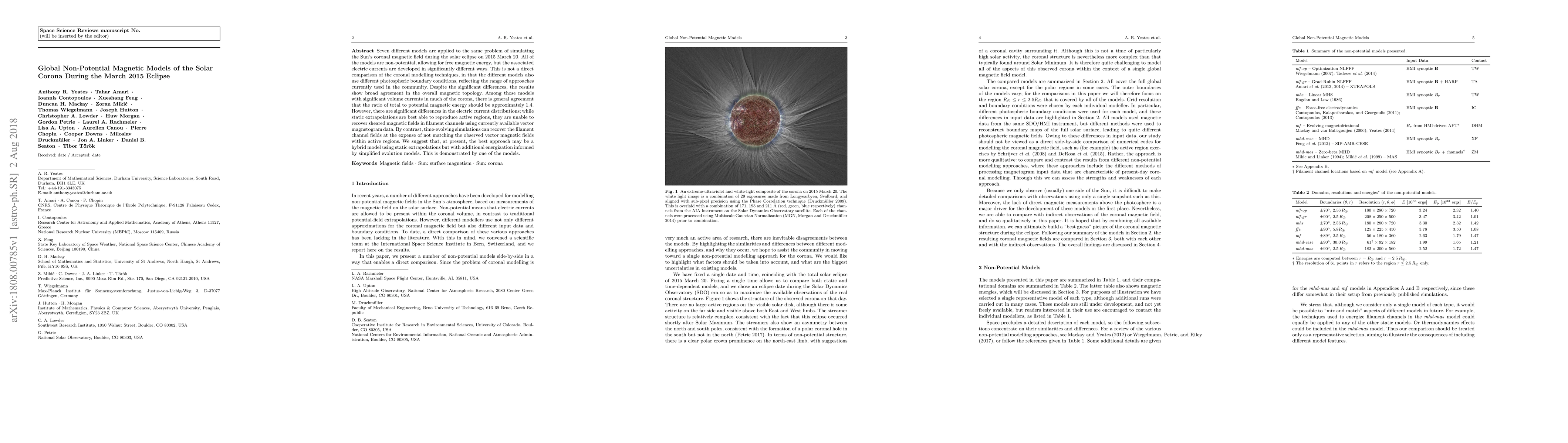 This paper compares seven non-potential magnetic models to simulate the solar corona's magnetic field during the 2015 March solar eclipse, finding broad agreement in magnetic topology despite differences in current distributions and boundary conditions. The study suggests a hybrid model combining static extrapolations with simplified evolution may offer the best current approach.