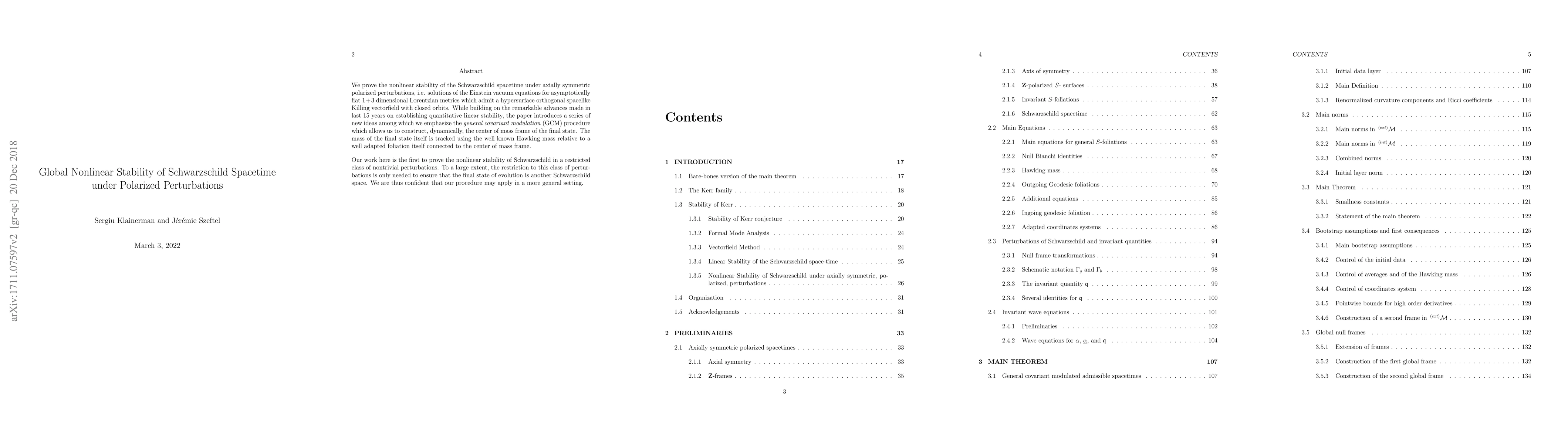 This paper proves the nonlinear stability of the Schwarzschild spacetime under axially symmetric polarized perturbations, introducing a new general covariant modulation procedure to dynamically construct the center of mass frame. The study focuses on a restricted class of perturbations to ensure the final state remains a Schwarzschild space, suggesting potential broader applicability.